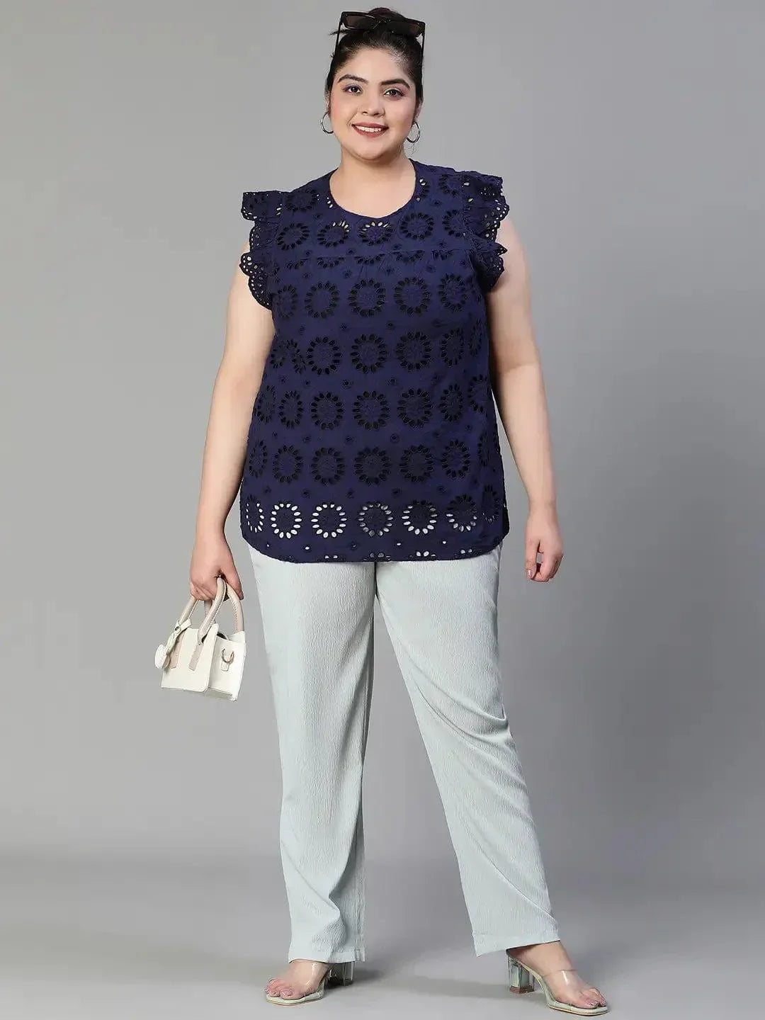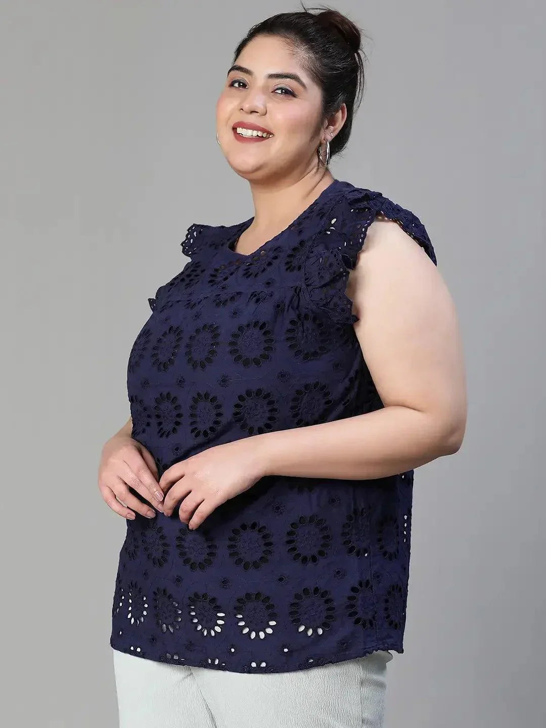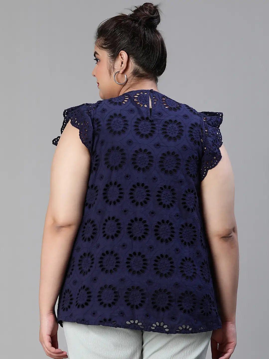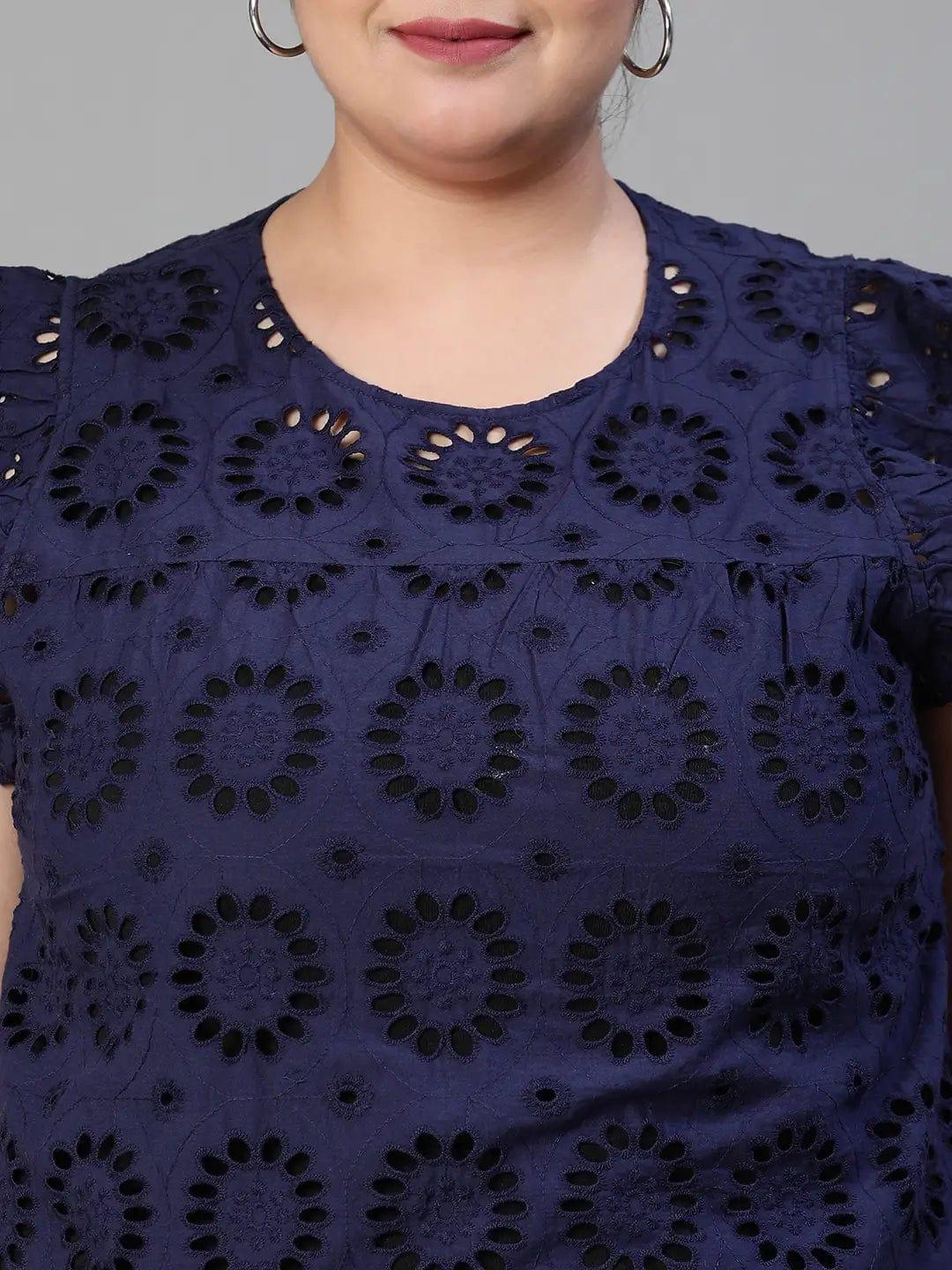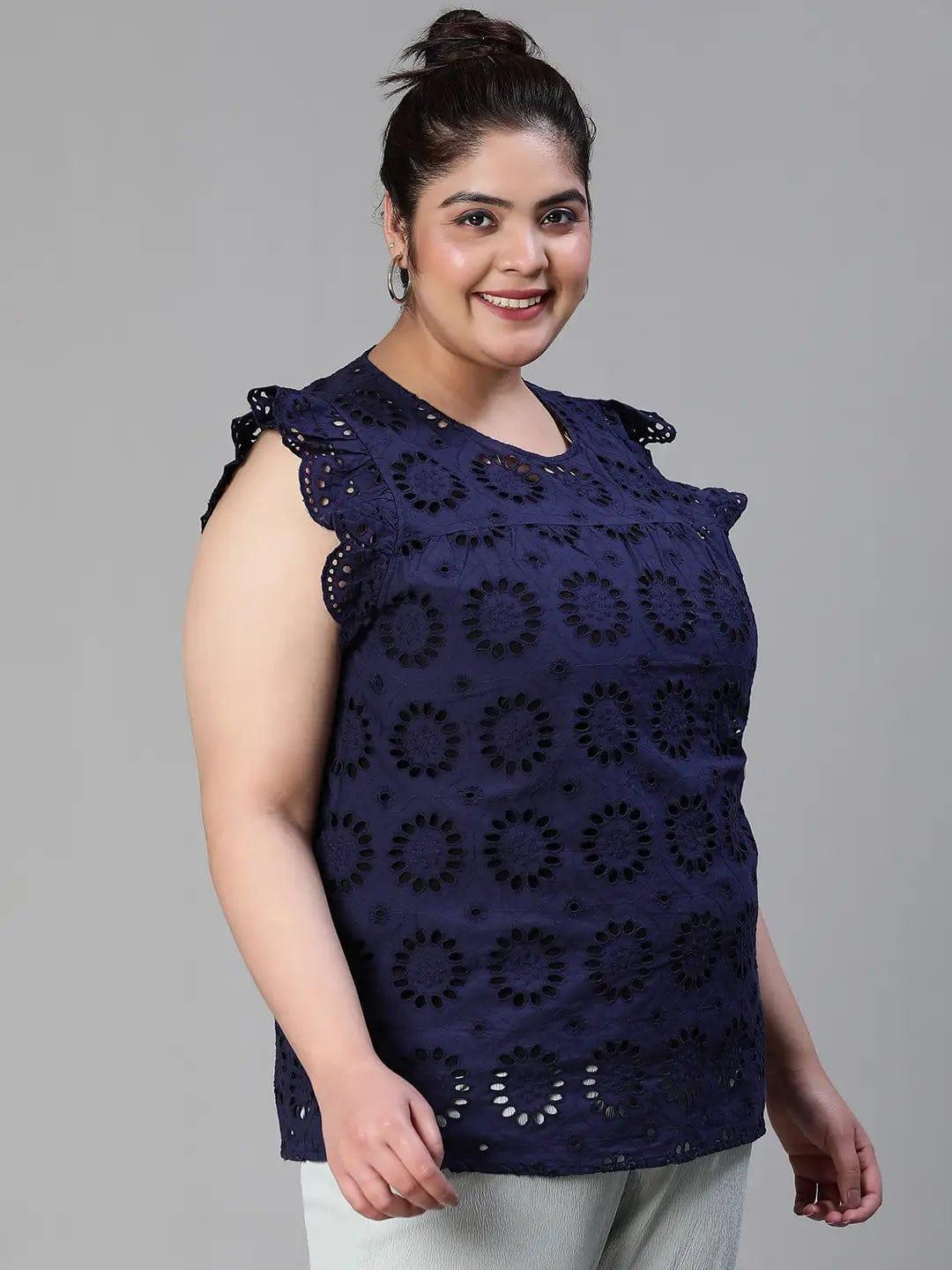 Elevate your style with the Active Blue Schiffli Petal Sleeve Plus Size Women Cotton Top. Crafted from premium organic cotton, it offers comfort, durability, and a flattering fit for all plus-size body types.