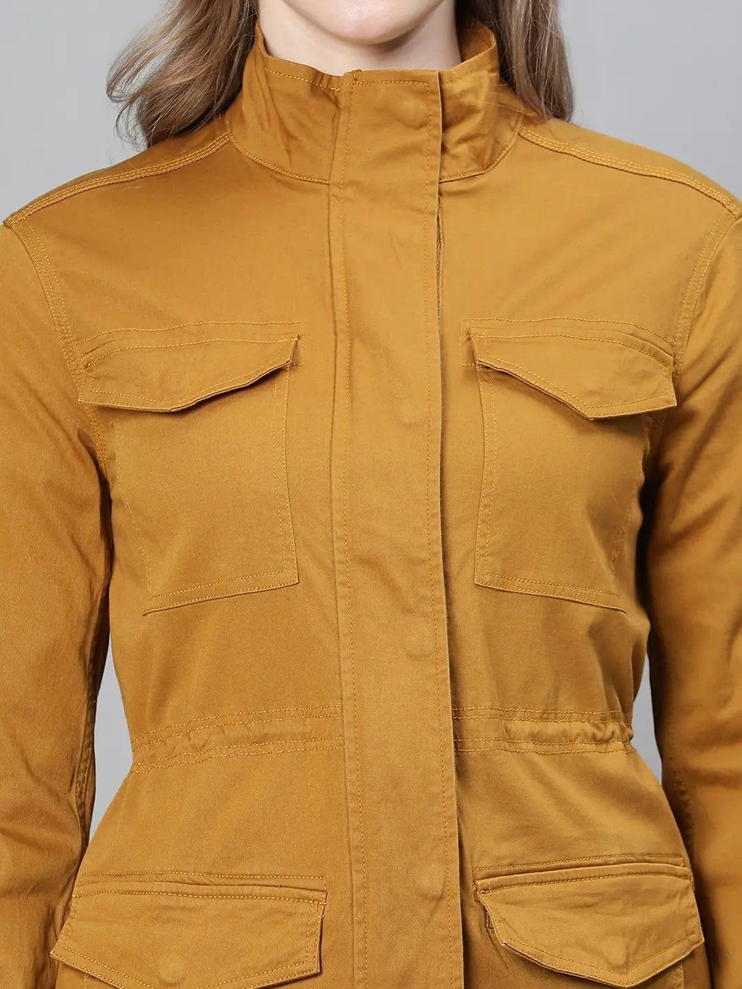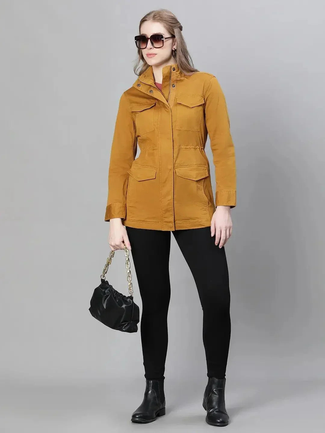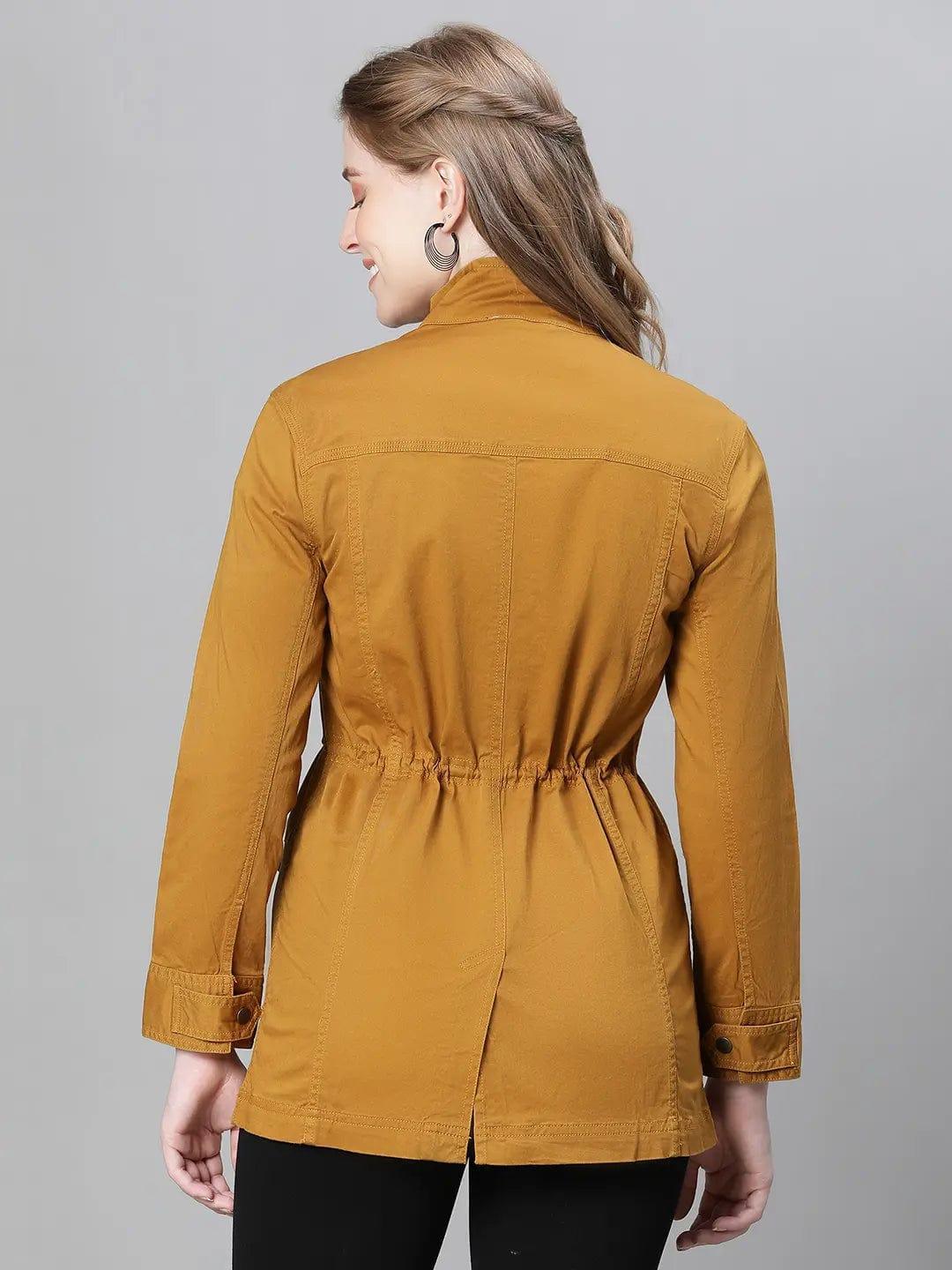 The Mustard Button-Down Women's Cotton Jacket is a perfect addition to your winter wardrobe. Designed for a comfortable fit, it features a high neck, snap buttons, zip closure, multiple pockets, and an adjustable waist. Pair it with stylish bottoms to stay fashionably warm all season.
