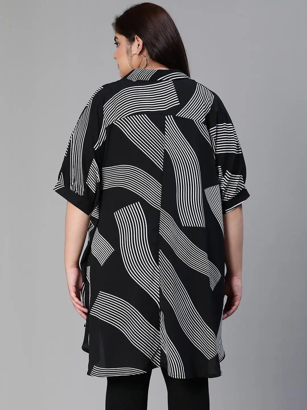 Move, groove, and slay in style wearing this lash black printed baggy style button-plus size tunic. That is embraced with a great style, and fashion and consists of a finest baggy fit, great quality, and is wearable in all seasons. Designed with polyester fabric, it features an all-over contemporary print, and a regular collar along with a placket of buttons, short sleeves, round hem, and length to the thighs. Style it with nice-looking bottom wear and get the comfortable trendy casual look for all occasions.