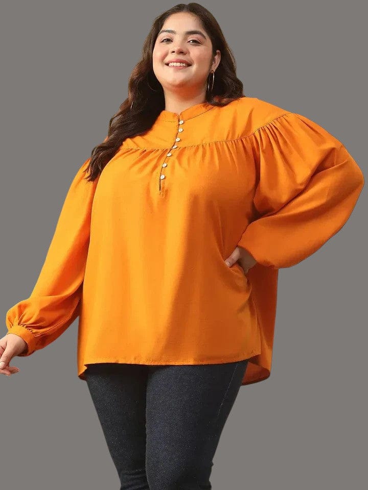 Pop Of Color And All-Day Comfort, This Summer Orange Round Neck With Button Placket Long Lantern Sleeve Plus Size Women Top, Specially Crafted For Plus-Size Beauties Who Love A Blend Of Simplicity And Statement. Made With Soft, Breathable Viscose Spun Fabric, It Offers A Relaxed Fit With A Smooth Finish That Keeps You Comfortable All Day Long. The Classic Round Neckline Paired With A Subtle Button Placket Detail Adds A Dash Of Charm, While The Long Lantern Sleeves Make It Perfect For Year-Round Wear. Whether you're heading To Work Or Weekend Brunch, This Top Adds The Right Touch Of Brightness To Any Outfit.