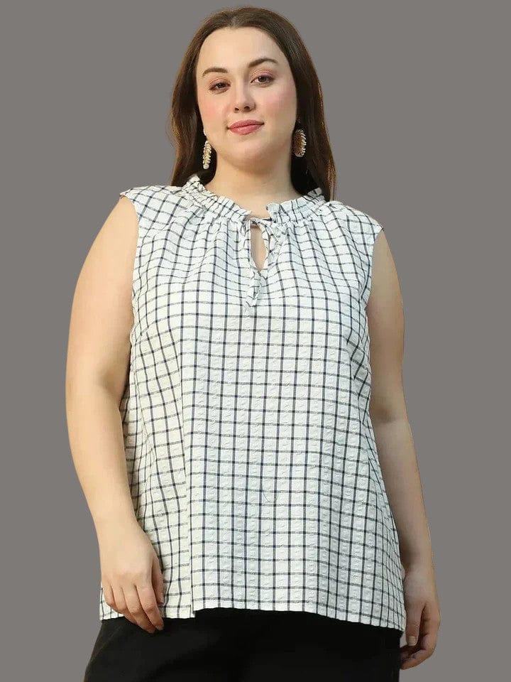 Stay stylish and comfortable with the Pinnacle White Check Print Tie-Up detail Sleeveless Plus Size Women Cotton Top. Made from soft, breathable cotton, this top features a classic check print in crisp white, adding a timeless charm to your wardrobe. The round neckline with a trendy tie-up detail enhances the look, while the sleeveless design keeps you cool and chic during warmer days. Perfect for pairing with jeans, skirts, or shorts, this top offers effortless style and comfort for any casual occasion.