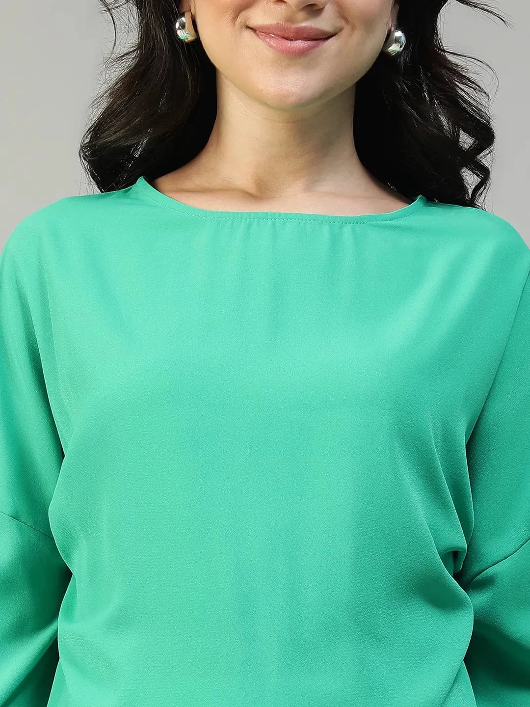 Green, Graceful, And Full Of Playful Charm. This Aesthetic Solid Green Round Neck Long Sleeve With Tie-Up Detail Women Top Is All About Subtle Details That Make A Big Style Statement. Crafted From Smooth, Durable Polyester, It’S Lightweight, Easy To Maintain, And Perfect For All-Day Wear. The Round Neckline Keeps The Design Classic, While The Tie-Up Details On The Sleeves With Elasticated Ends Add A Flirty, Customizable Touch—Adjust The Ties To Suit Your Mood Or Let The Sleeves Drape Elegantly For A Soft, Feminine Silhouette. Long Sleeves Give It A Versatile, Polished Look, Making It Ideal For Layering Or Wearing Solo. The Solid Green Hue Provides A Refreshing, Timeless Appeal, Allowing This Top To Pair Effortlessly With Jeans, Skirts, Or Trousers. From Casual Outings To Semi-Formal Events, This Top Combines Comfort, Style, And A Hint Of Playful Sophistication In One Effortlessly Chic Piece.