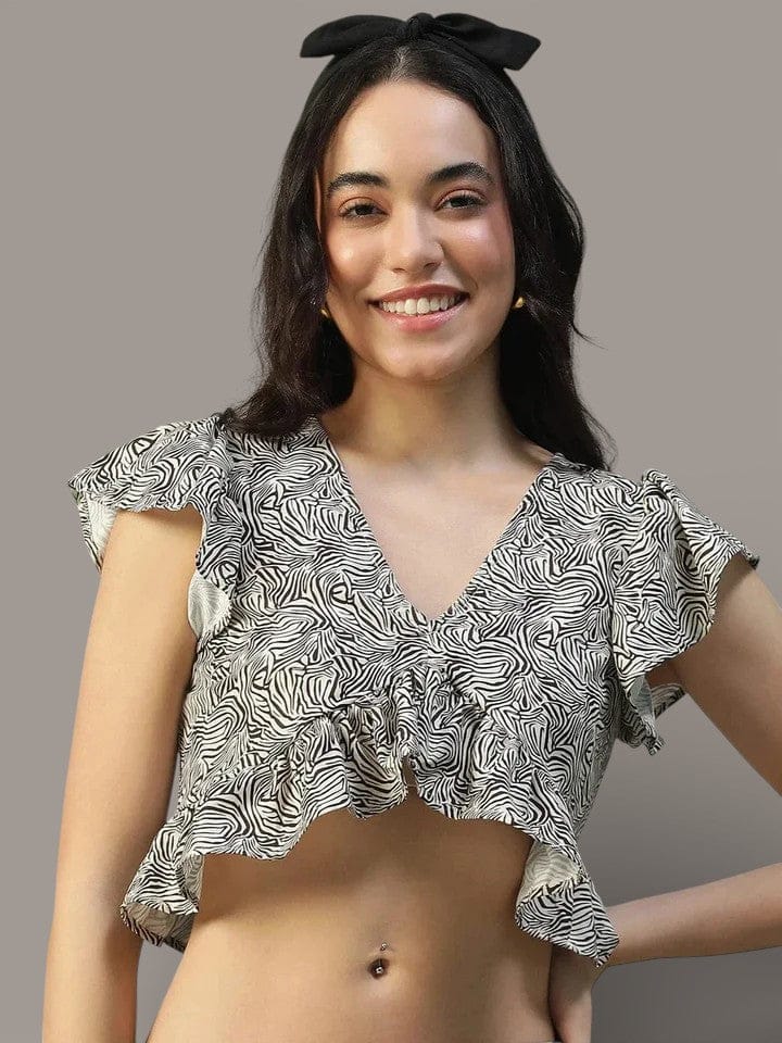 Untamed Style with a Feminine Touch – Embrace your wild side with this chic Loud Brown Animal Print Short Sleeve Ruffle Detail Women Crop Top in Slub Fabric, crafted in lightweight, breathable viscose slub fabric that feels soft, textured, and perfect for warm days. The all-over animal print blends earthy brown tones with brown accents, offering a fierce yet wearable look that stands out without overpowering. A flattering V-neckline, soft ruffle detailing at the sleeves and hem, and short sleeves add a romantic twist to the edgy print. Cropped for a youthful, easygoing silhouette, this top is perfect for mixing fierce patterns with feminine flair.