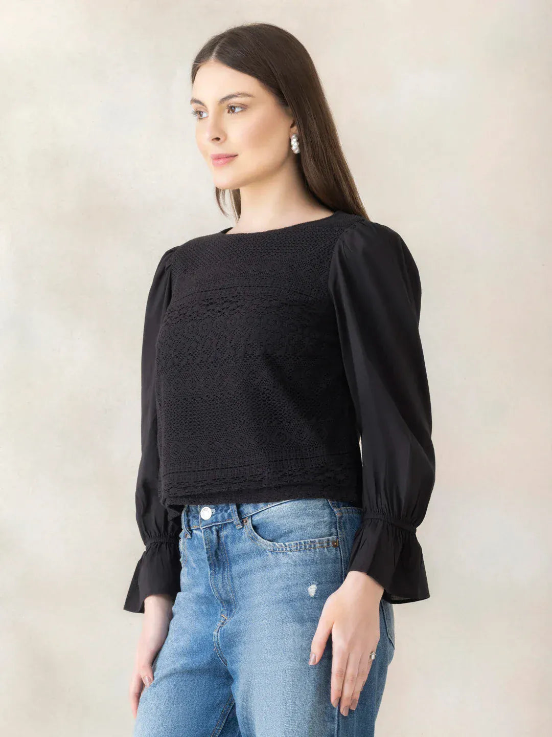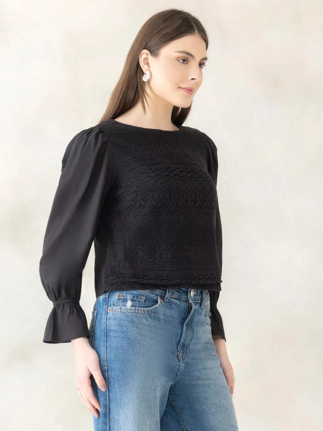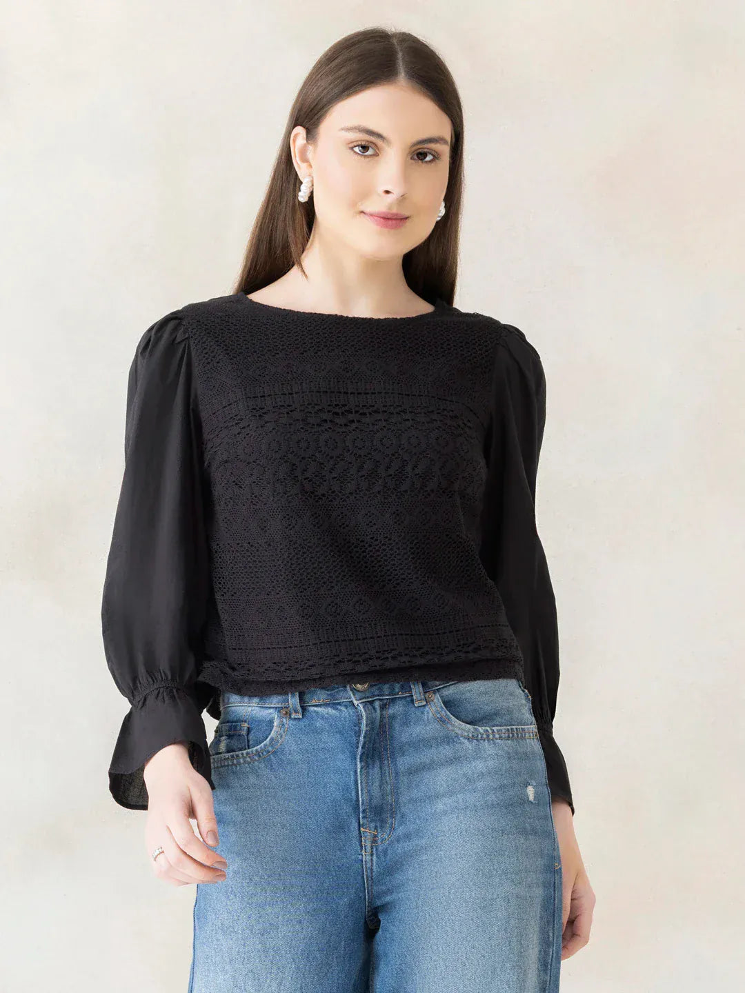 Stay stylish without trying too hard with this Black top. Made using breathable Cotton, it is tailored in a Regular Fit fit for everyday comfort. Its lace pattern makes it look modern and trendy, while round neck neckline completes the western wear vibe. Ideal for casual, this ladies top is a must-have for smart casual dressing and effortless styling.