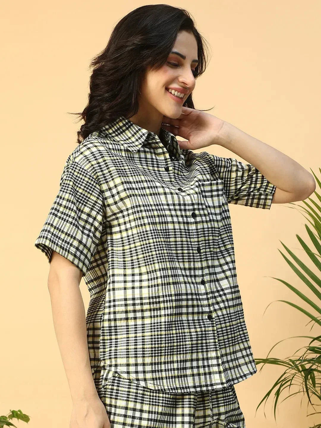 Where smart meets breezy—Smooth Black Check Print Short Sleeve Collared Women Shirt, is the wardrobe essential you didn’t know you needed. Crafted from cotton it comes with short sleeves, a sharp collar, and button-down front, offering easy style and comfort. The chest pocket adds utility, while the textured fabric elevates the look. Ideal for office hours or casual catch-ups.