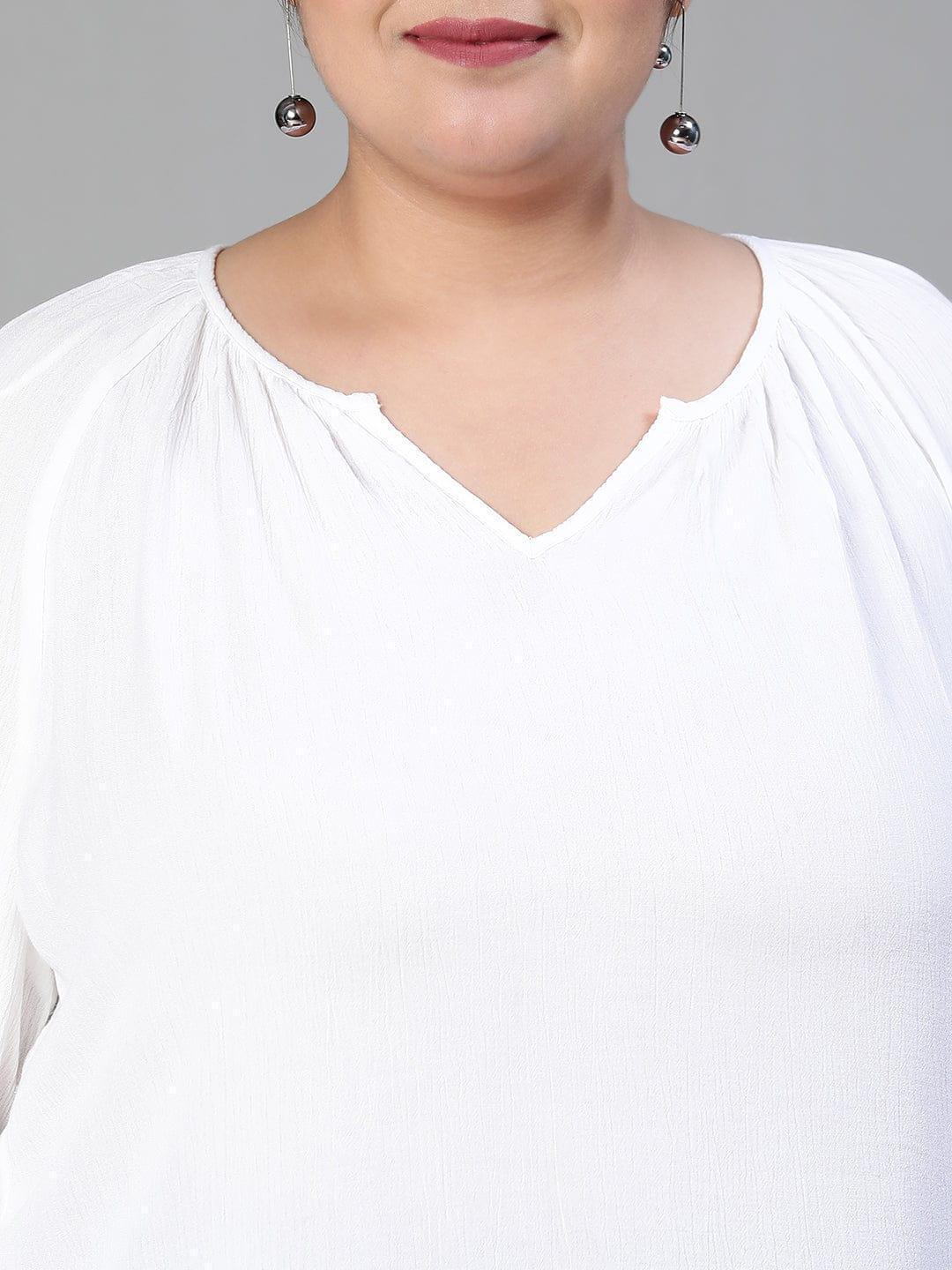 Keep your gorgeousness level on the peak by wearing this Blinged white embroidered plus size women's top which is pretty and classy and consists of the finest fit, and quality, and is wearable on all days. Designed with viscose fabric, it features a v-neckline, long sleeves fashioned with embroidery, a round hem, and length to the hips. Pair it with any stylish bottomwear to get the catchy classic everyday look.Â