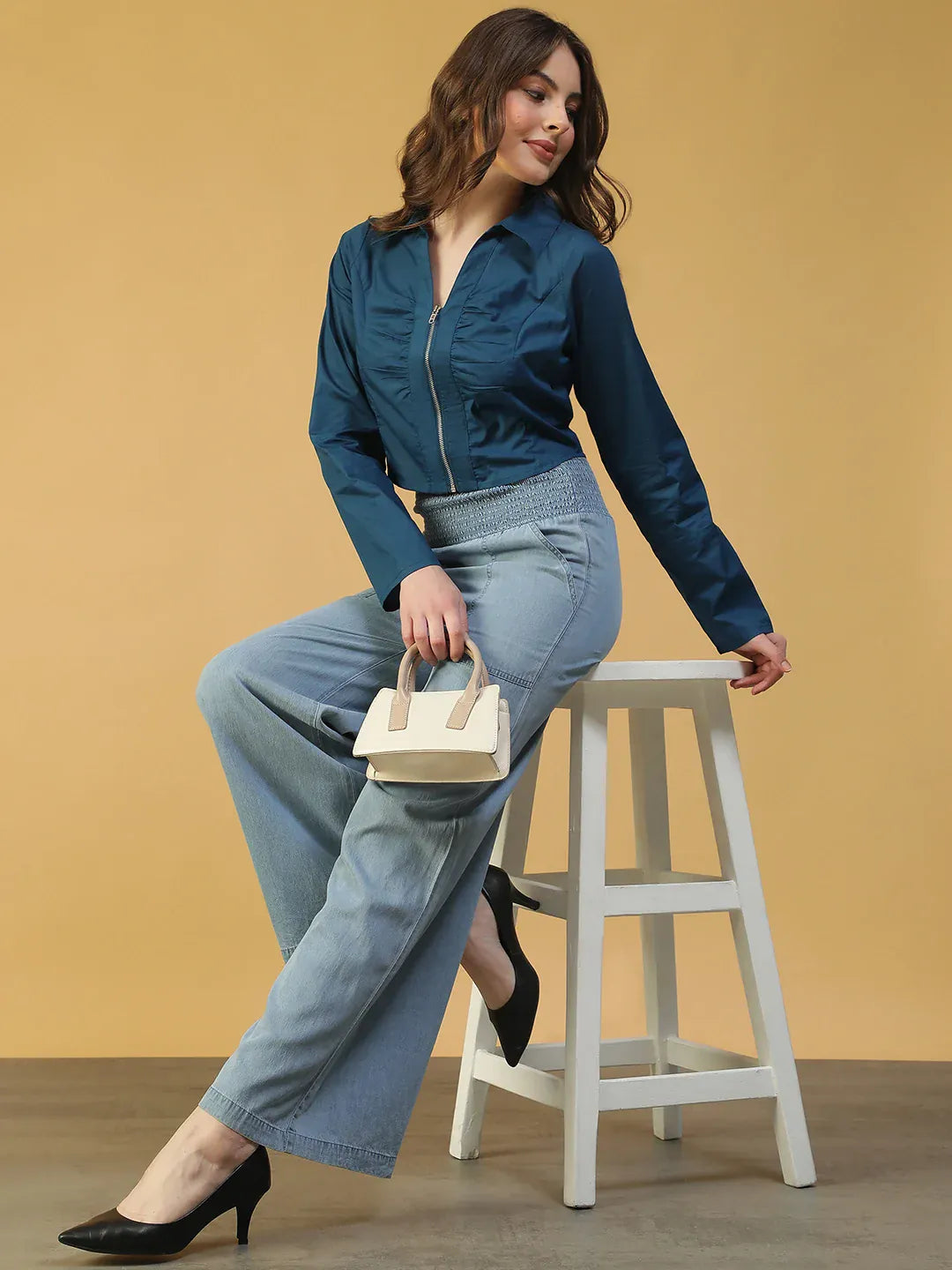 Step up your wardrobe with this Women’s Blue Long Sleeve Cotton Crop Top, perfect for comfort and style. Crafted from soft, breathable cotton, this women’s crop top features a collared neckline and zip-front closure for a modern, polished look. The gathered detail at the front adds texture and a flattering touch, while long sleeves make it ideal for cooler days or layering outfits. Its rich blue color pairs effortlessly with jeans, skirts, or trousers, making it suitable for casual outings, office wear, brunches, or weekend adventures. A versatile and chic women’s cotton top, it combines effortless elegance with everyday wearability.