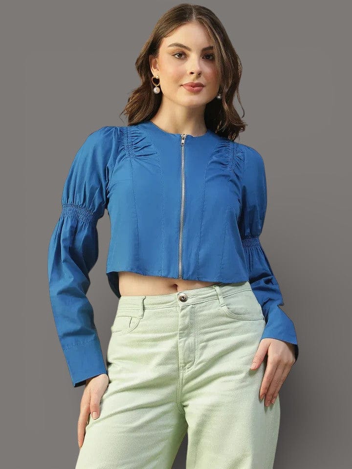 Elevate your wardrobe with this Women’s Solid Black Cotton Crop Top, perfect for casual and office wear. Made from soft, breathable cotton, it combines comfort and style effortlessly. The round neckline and zip-front closure offer a modern, versatile look, while smocking detail on the shoulders adds subtle texture and flair. Long sleeves make it ideal for layering or wearing on cooler days, and the solid black color ensures easy pairing with jeans, skirts, trousers, or shorts. Perfect for women’s casual outings, office-casual looks, weekend adventures, or evening meetups, this black crop top is both chic and practical. Its regular fit and curved hem provide a flattering silhouette, making it a must-have women’s top for versatile styling.