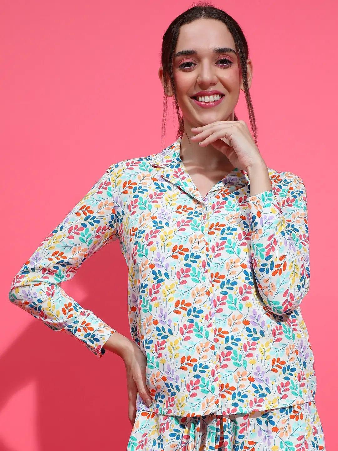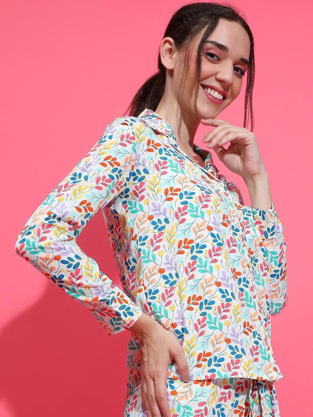 Introducing our Dearly white floral print long sleeve women nightwear shirt Your Summer Essential. Crafted from luxurious polyester fabric, this shirt offers both style and comfort in one delightful package. Its relaxed fit ensures maximum coziness, while the all-over floral print adds a touch of charm to your nighttime routine. Featuring a classic regular collar and a button placket, this shirt is as stylish as it is practical. With long sleeves and a round hem that falls just at the waistline, it s perfect for lounging in style. Pair it with your favorite nightwear pajamas or shorts from our nightwear section for the ultimate relaxation experience. Whether you re unwinding after a long day or enjoying a lazy weekend morning, our Floral Bliss Nightwear Shirt promises to keep you cute, comfy, and oh-so-stylish.