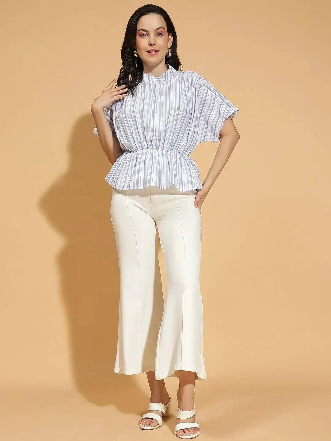 Infuse your wardrobe with effortless style with the Women Blue Stripe Print Round Neck Short Sleeve Button Down Elasticated Pleated Cotton Top. The crisp blue stripe print adds a fresh, modern twist, while the round neckline and button-down front create a classic, look. The short sleeves keep the design casual and comfortable. The elasticated waist ensures a flattering fit, accentuated by the elegant pleating that adds subtle movement and texture. Crafted from soft, breathable cotton, this top offers a luxurious feel and all-day comfort. Perfect for dressing up with tailored pants or keeping it casual with jeans, this versatile piece is a must-have for a chic, polished appearance.