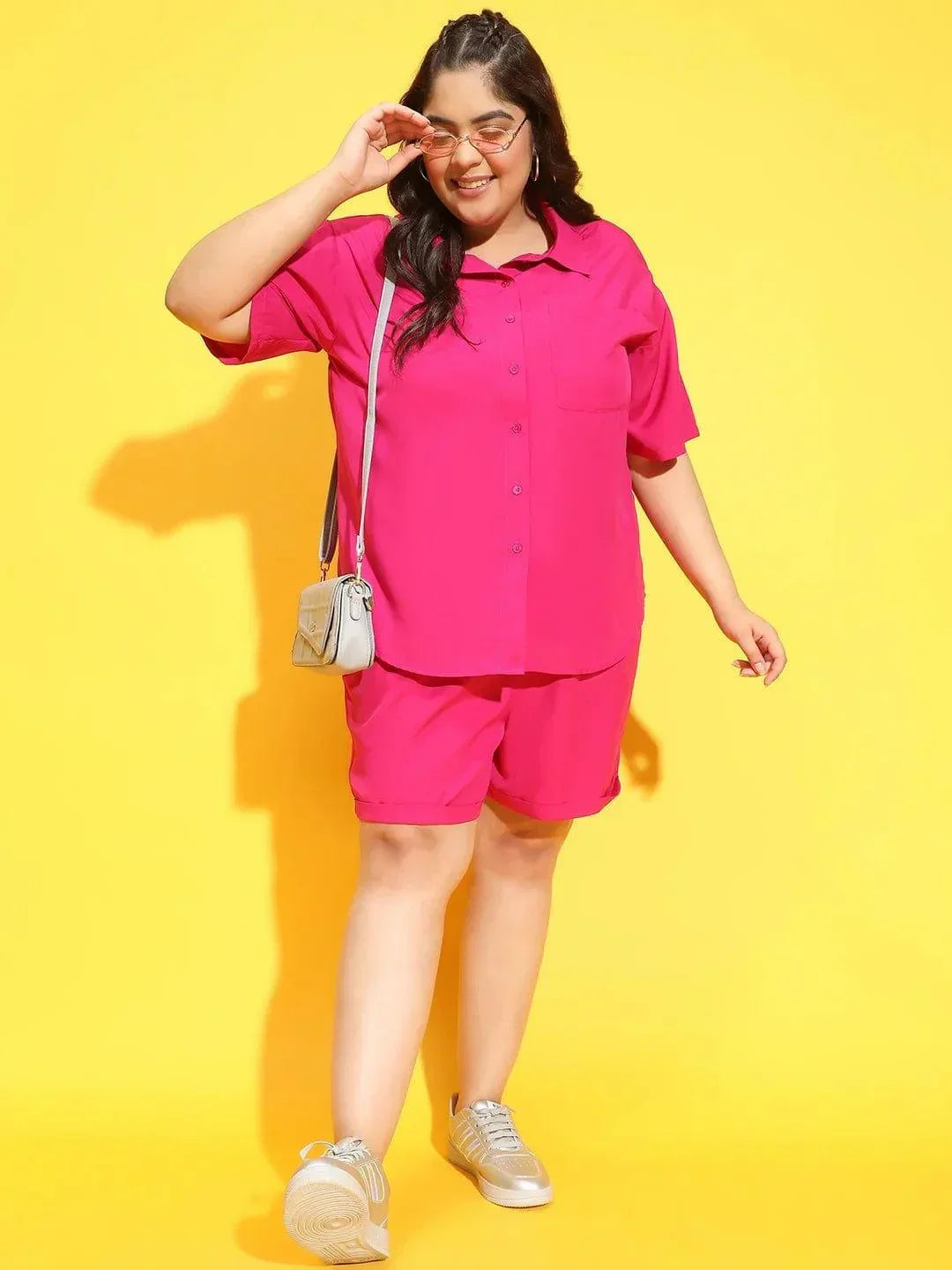 Amp up your style with our Blush Pink Two Piece Shirt And Shorts Plus Size Co-ord Set, meticulously fashioned from durable polyester to ensure lasting comfort. Curated for curves, this set features elasticated tie-up detailing shorts with the pockets on the side and a button-down short sleeve shirt. Sass up your wardrobe and look with chic sophistication in our exclusive plus-size co-ord set.