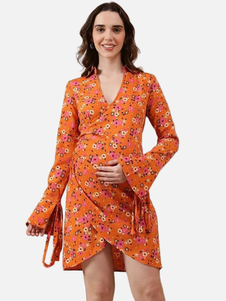 Step Into Comfort And Style, Mama-To-Be. This Bubbly Orange Floral Print V- Collared Neck Long Bell Sleeve With Tie-Up Detail Short Wrap Dress Is Designed To Flatter Your Bump While Keeping You Effortlessly Chic. Made From Soft, Lightweight Polyester, It’S Breathable, Easy To Wear, And Moves With You, Giving You Comfort Throughout Your Pregnancy. The V-Collared Neckline Adds A Flattering, Elongating Touch, While The Long Bell Sleeves Provide A Graceful, Airy Feel. The Wrap Design,Offering Maximum Comfort And A Personalized Fit At Every Stage. Finished In A Vibrant Orange Floral Print, This Short-Length Dress Brings A Playful, Summery Charm That Makes It Perfect For Casual Outings, Brunches, Or Baby Showers. Thoughtfully Crafted To Accommodate Your Growing Bump, The Dress Balances Comfort With Style, Letting You Embrace Every Stage Of Your Pregnancy With Confidence And Ease.