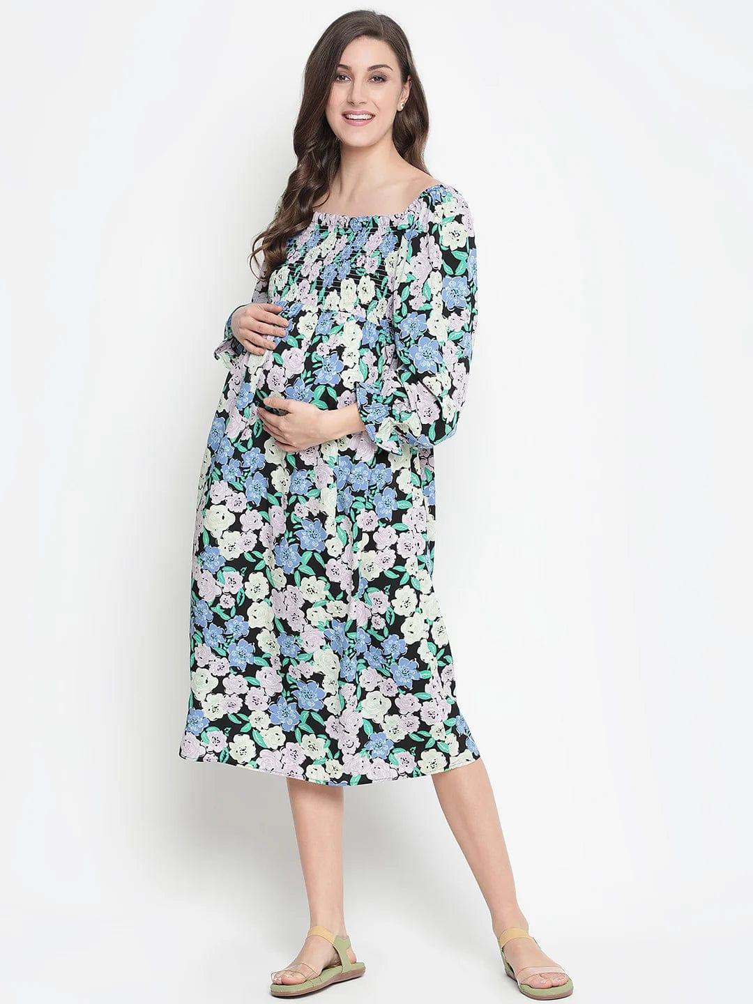 Hold the spark in your look this season with Camp of colors floral print easy maternity smocking dress. Made with breathable soft polyester fabric, it is decked up with flower print, long sleeves, stylish square neck, and smocking in front on the chest for the glam look. It is the perfect outfit for the daily household look or your outing look due to its comfort and stylish feature.