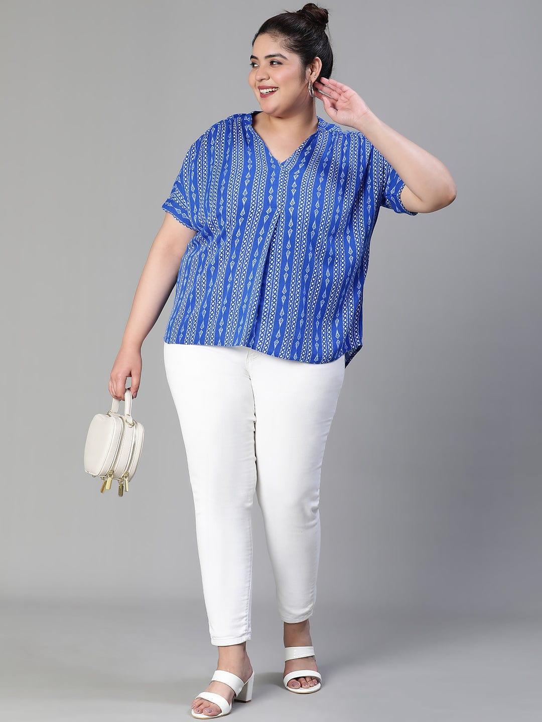 New and modern, this Cobalt blueprint Plus size women's casual top is the coolest classy pick for an everyday look. Made with viscose fabric, it is the right choice in fashion, has a great style and quality, and is wearble in all seasons and weather. It features an all-over trendy print, a V-neckline, short regular sleeves, a round hem, and length to the waist. Pair it with white color bottom-wear and your go-to look is all ready.