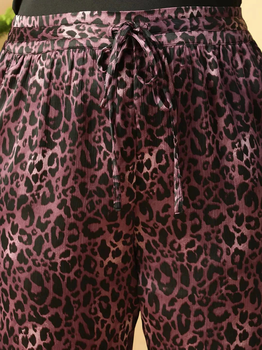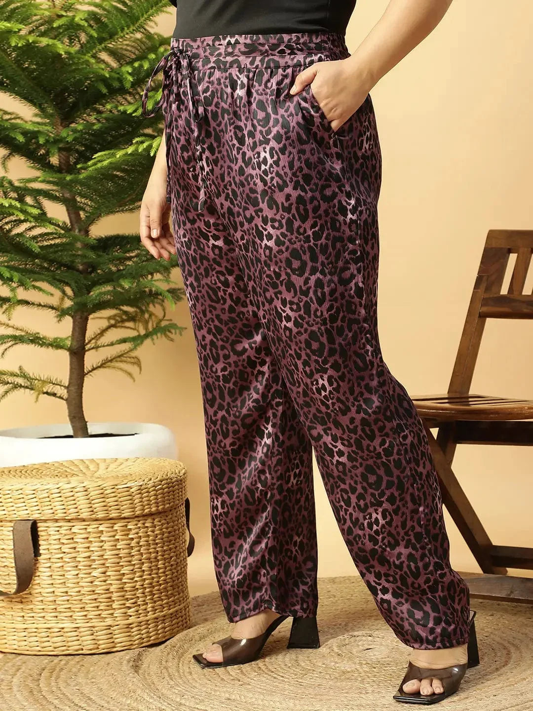These Dark Purple Animal Satin Print Elasticated Plus Size Women Pants are crafted from soft, breathable polyester for all-day comfort. The elasticated waistband ensures a perfect fit, while the adjustable tie-knot thread detail adds a stylish touch.