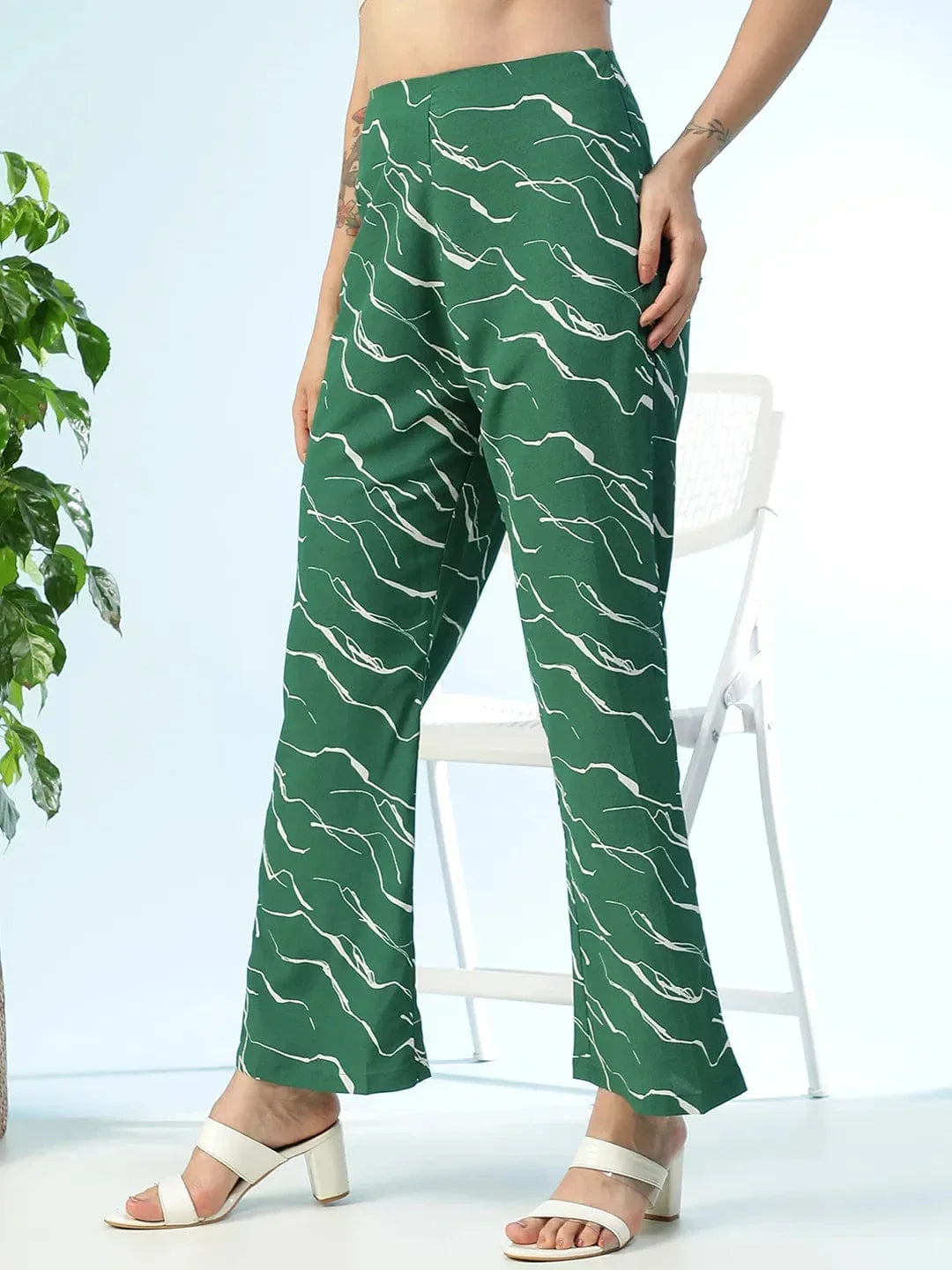 Say hello to your new favorite go-to: the Flexette Green Printed Elastiacted Women Flare Pant, where vibrant design meets all-day comfort. Made from lightweight, smooth polyester, these pants offer a breezy, airy feel that’s perfect for warm days, casual outings, or when you just want to stand out in effortless style. The striking green base with an all-over printed pattern adds a playful, modern vibe to your look, giving just the right pop of color without going over the top. Whether it's florals, abstracts, or tropical motifs – the print is here to give your outfit energy and edge. Designed with an elasticated waistband, the fit is easy and relaxed—no fussy zippers or buttons, just pull-on-and-go comfort. The flared silhouette starts easy at the top and flows wide towards the hem, creating a flattering drape that elongates your legs and moves with every step