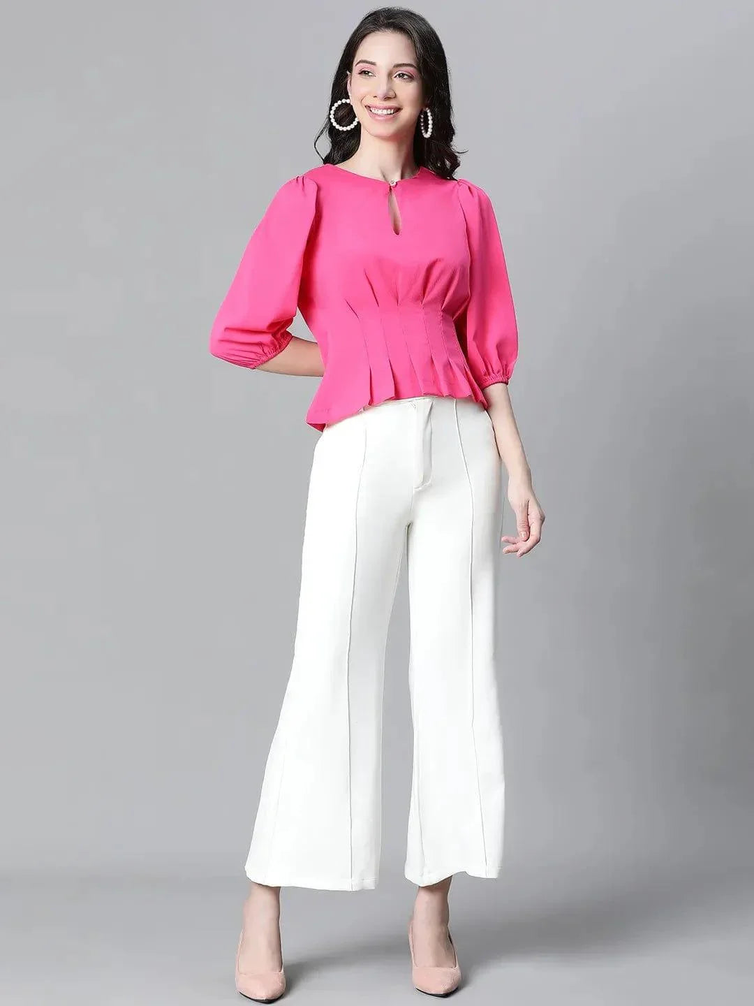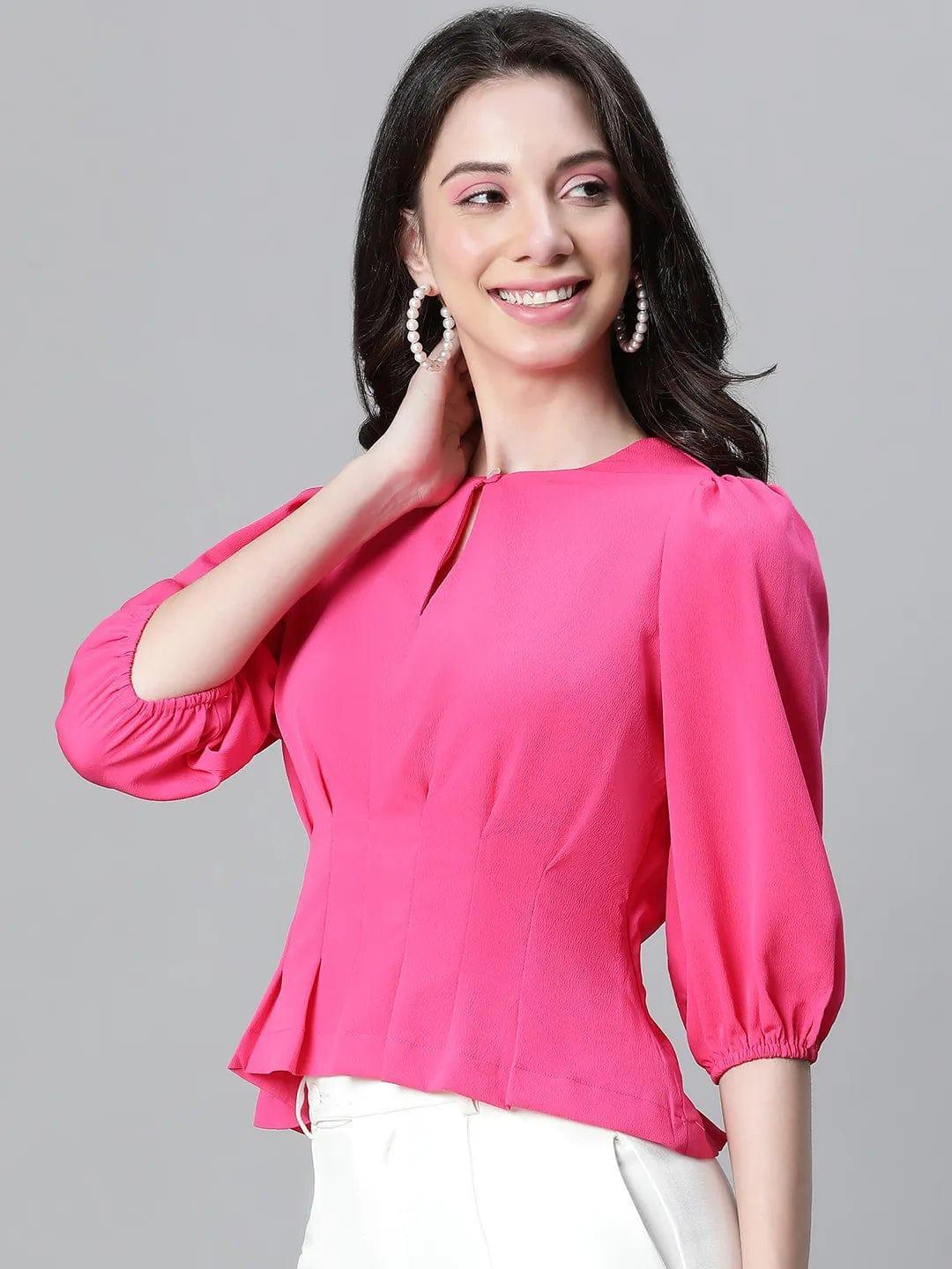 Get a flawless look with this Fuchsia keyhole neck pleated women top. Crafted from high-quality polyester material, it features a trendy keyhole neck, 3/4 sleeves, and a flattering pleated design. Perfect for special occasions or making a fashion statement. Choose from various colors and patterns to match your style.