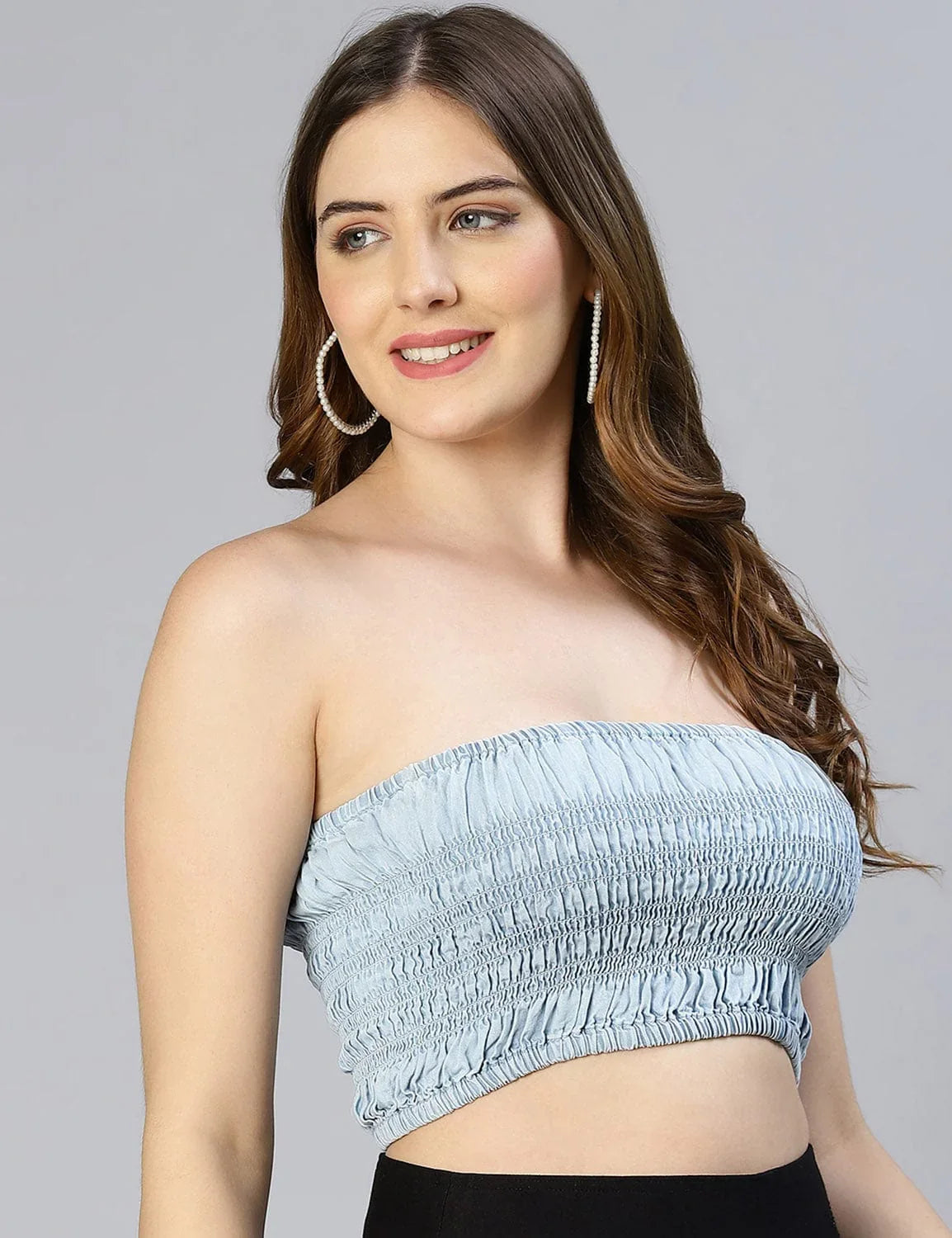 Grab this super hot and chic Glacial light blue smocked women's tube top that is super trendy, exclusive, and a must-have addition to your wardrobe. Designed with organic cotton fabric, it is stretchable, rich in quality, and has the finest fit. It features all over smocking in front & back and short crop bustier length. Be it a luxury lunch scene, or happening at night parties, picking this would be a super hot idea and for the optimum look style this with a stylish top, skirt, or shorts, or don an oversized shirt over it for an urban cool look.
