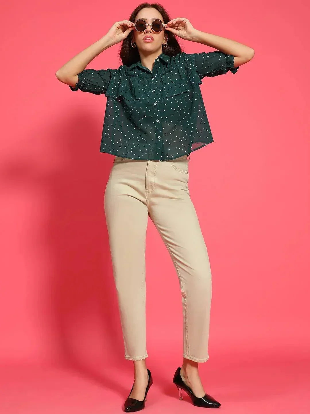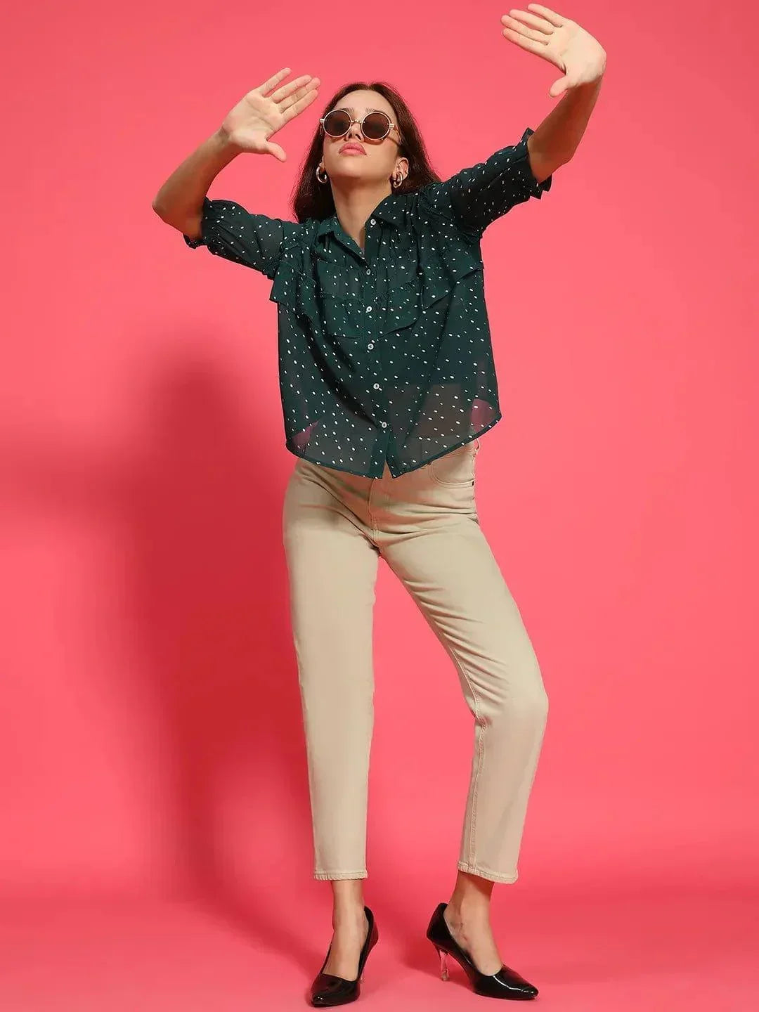 Glimmering Green Ruffle Detail Foil Print Women Party Wear Shirt featuring a short sleeves and a foil print that adds a touch of shimmer. The ruffle detailing brings a trendy flair, while the sheer polyester fabric offers a light and airy feel. This versatile shirt combines a classic collared design with modern elements, making it an ideal choice for both casual outings and more dressed-up occasions. Pair it with partywear pants or casual jeans, this shirt is going to look super with all matches
