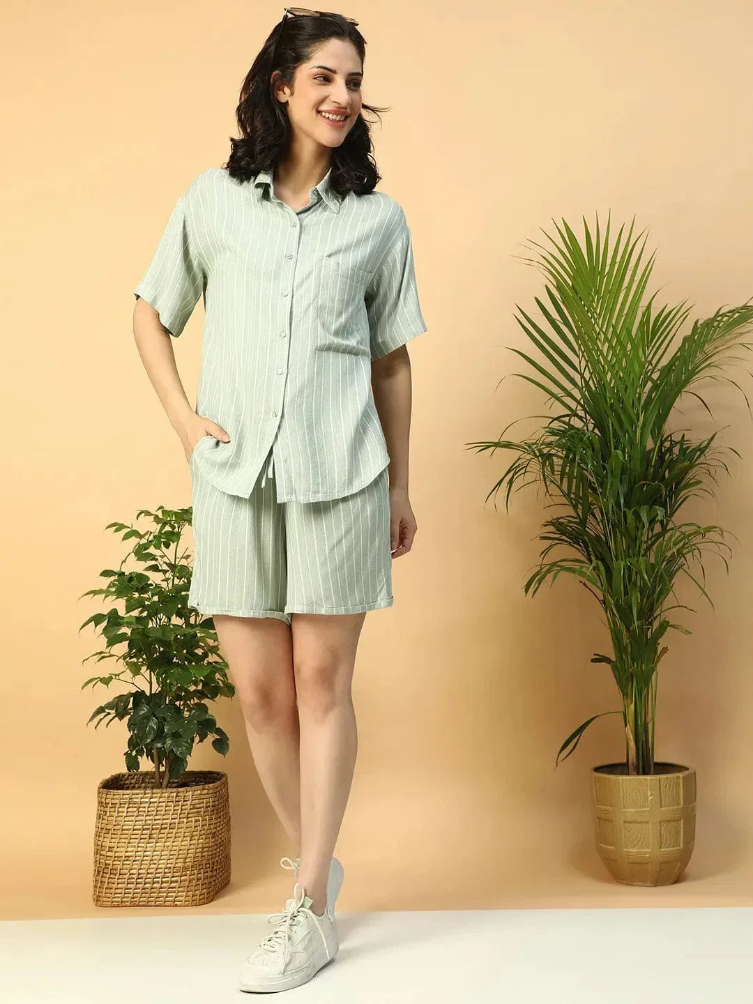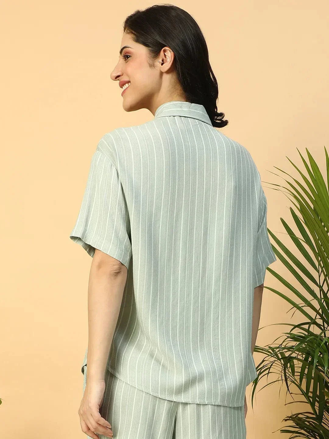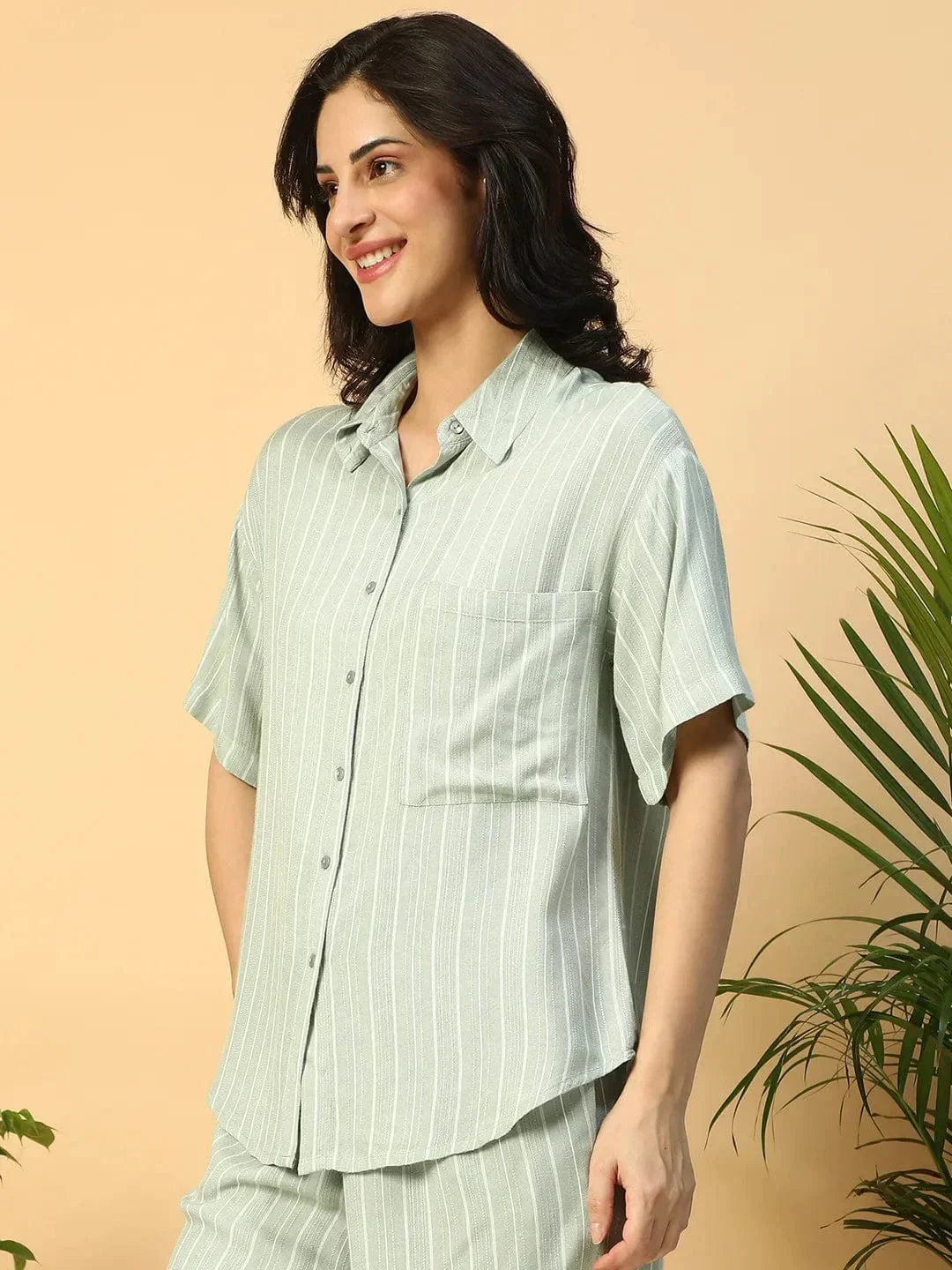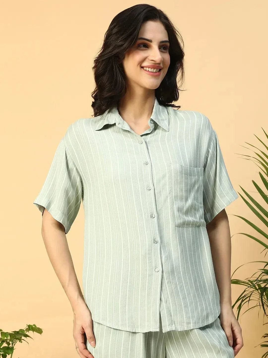 Striped to perfection for everyday chic, this Green Stripe Print Short Sleeve Collared Rayon Dobby Women Shirt blends comfort with effortless style. Made from soft and breathable viscose fabric, it features a collared neckline, short sleeves, and a button-down front for a timeless look. The subtle dobby texture adds a refined touch, while the chest pocket offers a hint of utility. Perfect for a smart-casual day out—just pair with denim or culottes.