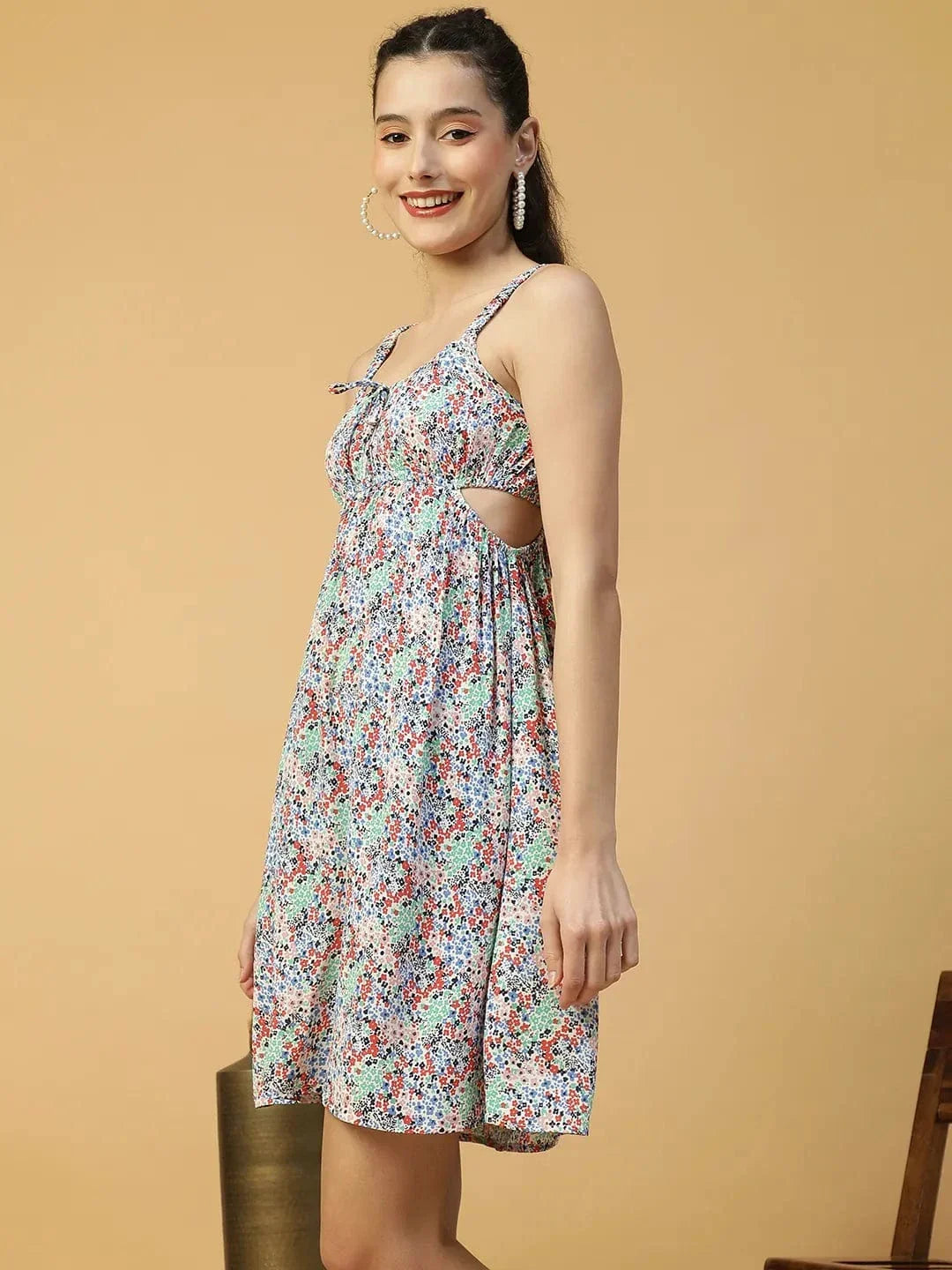 This Heaven Blue Floral Print Elasticated Sleeveless Cut Out Women Dress is a perfect blend of style and comfort. Crafted from soft and breathable viscose fabric, it features a flattering V-neckline with a chic tie-up detail and shoulder straps. The elasticated waist ensures comfort while accentuating your silhouette, and the sleeveless design with trendy cut-out details adds a modern twist. The vibrant blue floral print brings a fresh, feminine vibe, making it the ideal choice for sunny days, picnics, or casual outings. Stay cool and stylish all season long