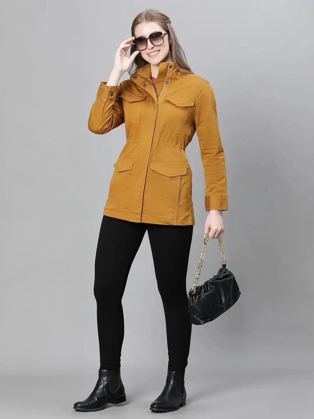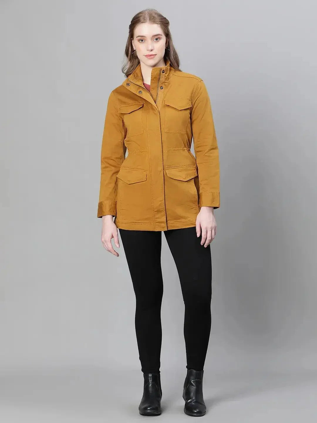 The Mustard Button-Down Women's Cotton Jacket is a perfect addition to your winter wardrobe. Designed for a comfortable fit, it features a high neck, snap buttons, zip closure, multiple pockets, and an adjustable waist. Pair it with stylish bottoms to stay fashionably warm all season.