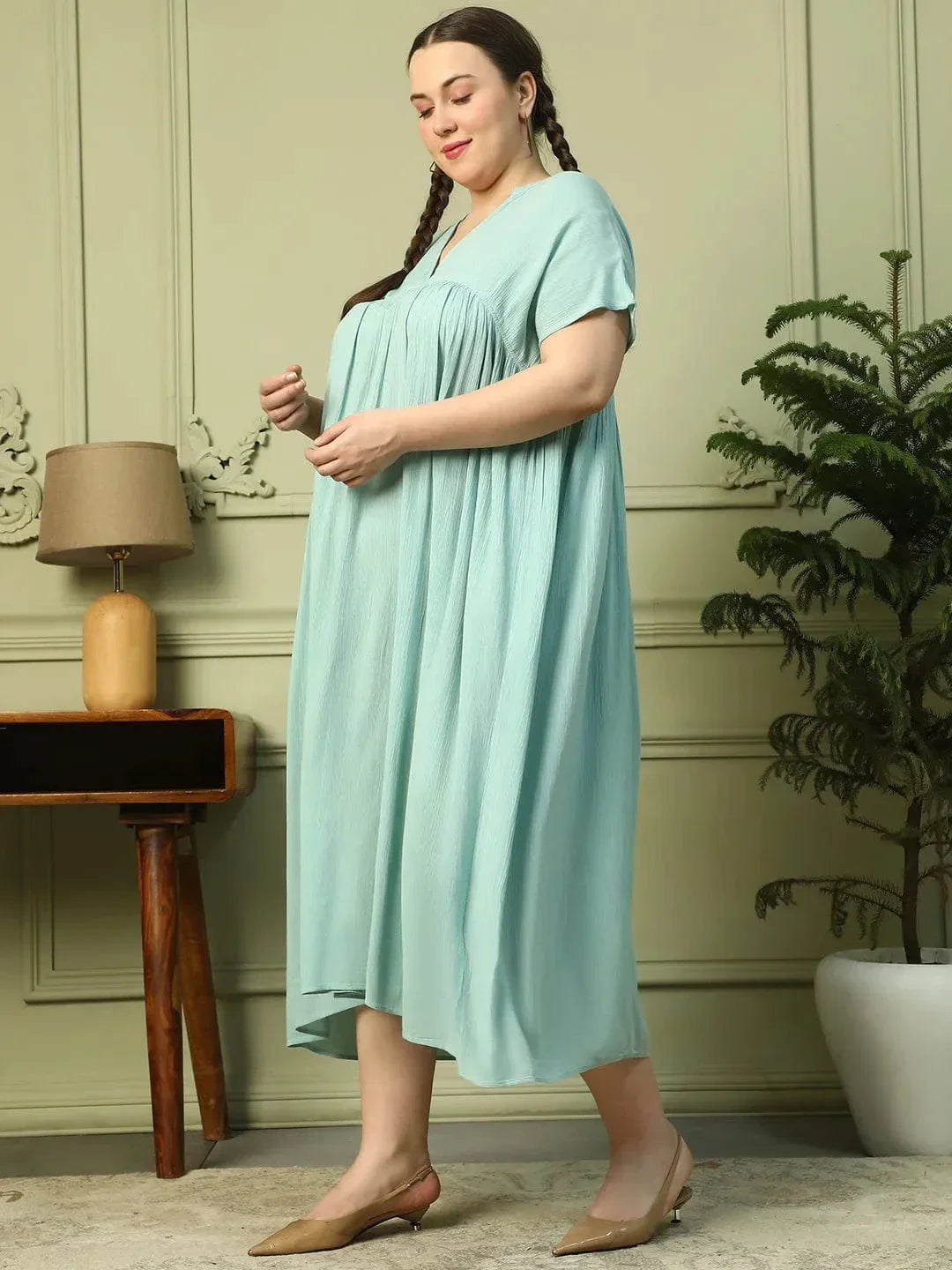 Land into the world of trend with the Light Green Short Sleeve Rayon Crepe Long Maxi Plus Size Women Dress. Crafted from soft viscose, this dress offers a smooth and breathable fit, keeping you comfortable all day long. The V-neckline enhances the flattering silhouette, while the short sleeves add a touch of relaxed elegance. The flowing long maxi design gives you a graceful look, making it perfect for any occasion. In a refreshing light green shade, this dress is a timeless addition to your wardrobe that combines style and comfort effortlessly.