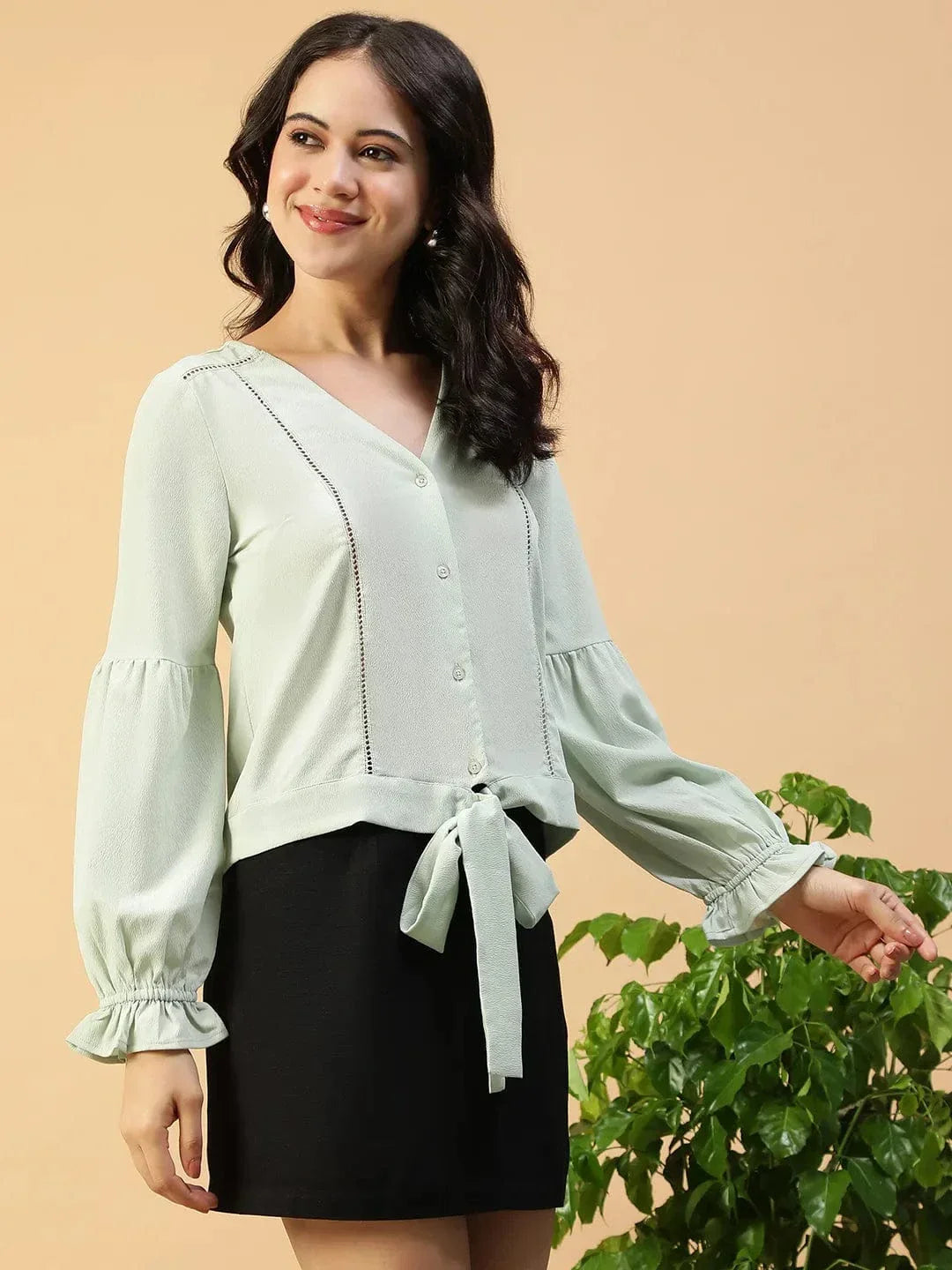 Soft, flowy, and just the right amount of fancy—our Slore Light Green Button-Down Women Top with Tie-Knot and Lace Detail is a dreamy addition to your wardrobe. Made from lightweight polyester, this top features elegant long poet sleeves that bring in all the drama, a flattering V-neckline lined with delicate lace, and a cute tie-up detail that adds a playful finish. The button-down front gives it that versatile charm—wear it buttoned up or slightly open, depending on your vibe. Whether you're headed to brunch, a coffee catch-up, or just dressing up for yourself, this top is a total mood.
