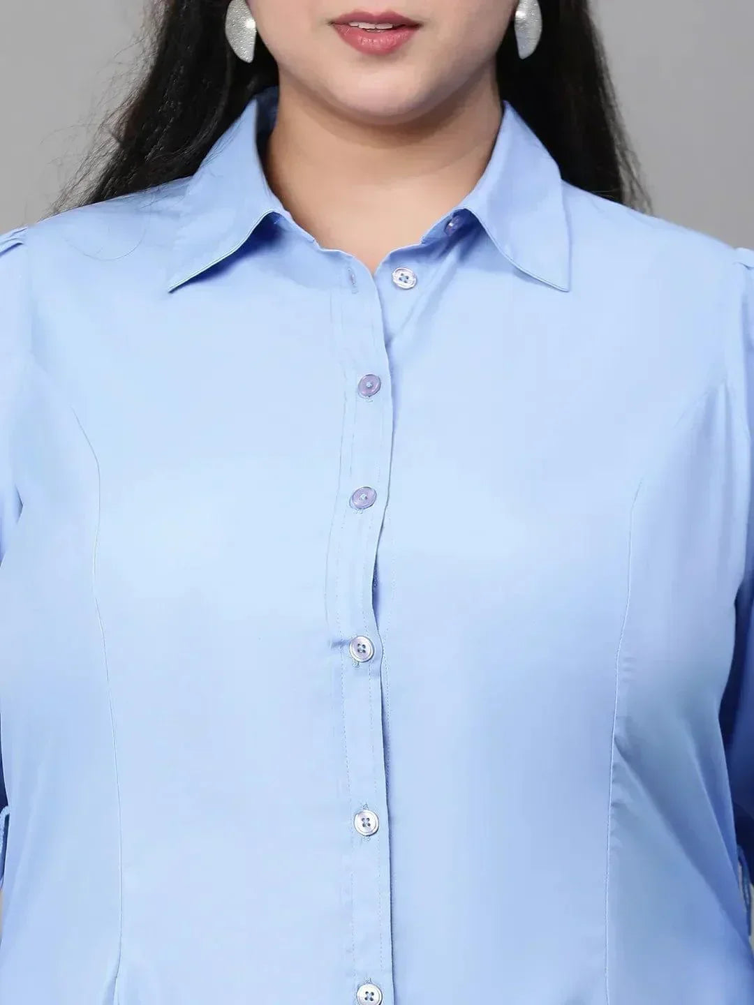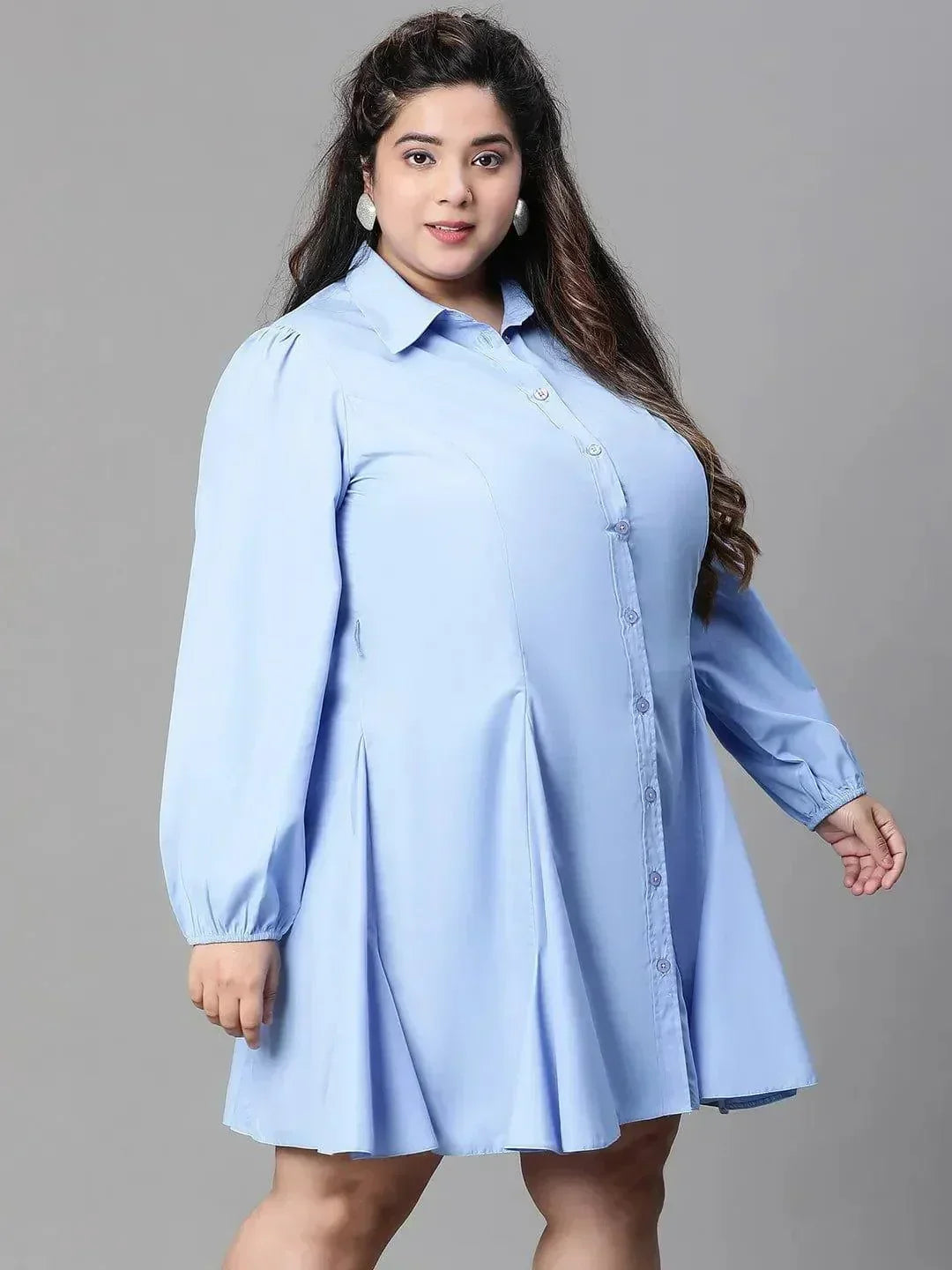 Elevate your style with our Magnified blue long-sleeve button-down plus-size women's cotton dress. Expertly crafted from soft cotton, this knee-length dress is both comfortable and chic. Its cool and catchy design effortlessly pairs with heels or boots, making it a versatile choice for any season. Make a statement with this crisp and stylish addition to your wardrobe, perfect for all occasions
