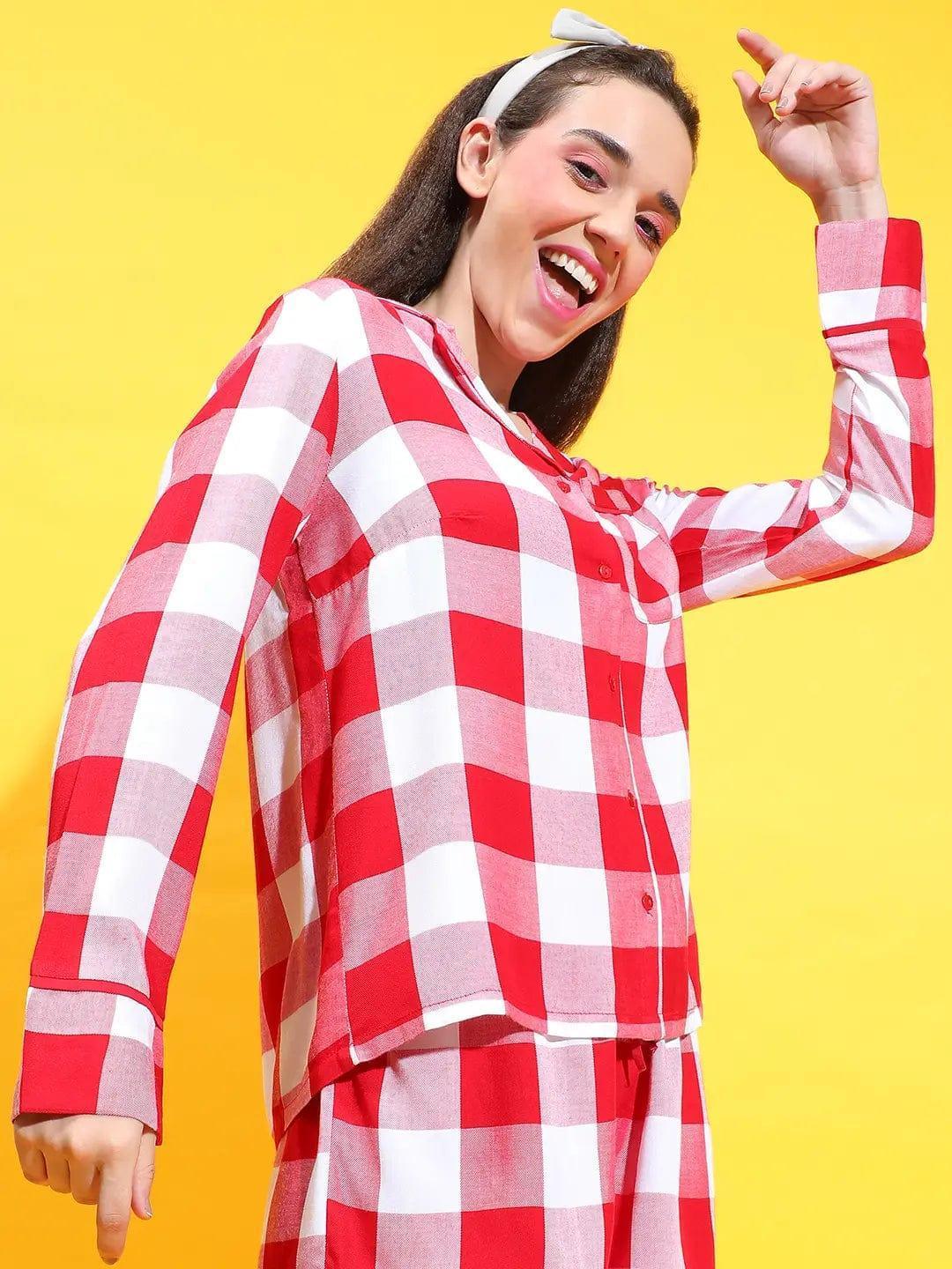 The modern Red Long Sleeve Women Nightwear Shirt is crafted for both comfort and style. Made from luxurious viscose fabric, this shirt ensures a soft and gentle feel against your skin for a cozy night’s sleep. Featuring a classic round neckline and long sleeves, it offers timeless elegance with a touch of sophistication. The button-down front adds a classic detail, while the red check print adds a pop of color and personality to your nighttime ensemble. Pair it with your favorite pajama bottoms from our nightwear pajama/short section for a complete bedtime look that is both stylish and cozy. Embrace nighttime relaxation in style with this versatile red check print nightwear shirt.