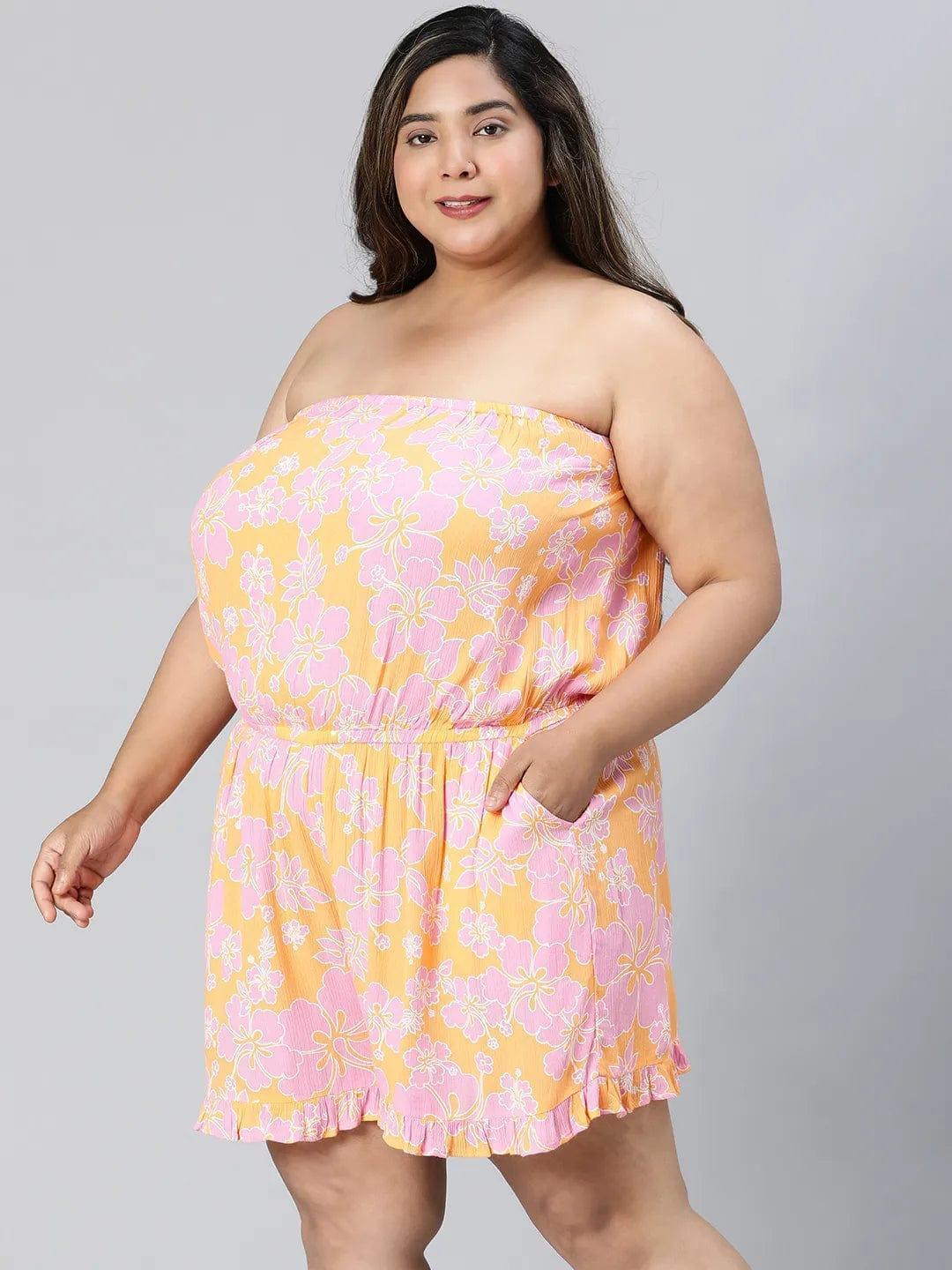 Meet our playful and vibrant Multicolor Floral Print Elasticated Off-Shoulder Plus Size Beachwear Playsuit. The elasticated design ensures a perfect fit, while the tie-up waistline adds a flattering touch to your curves. Crafted with soft viscose fabric, this playsuit offers comfort and style for any beach occasion. Embrace effortless chic with this must-have addition to your beach wardrobe.