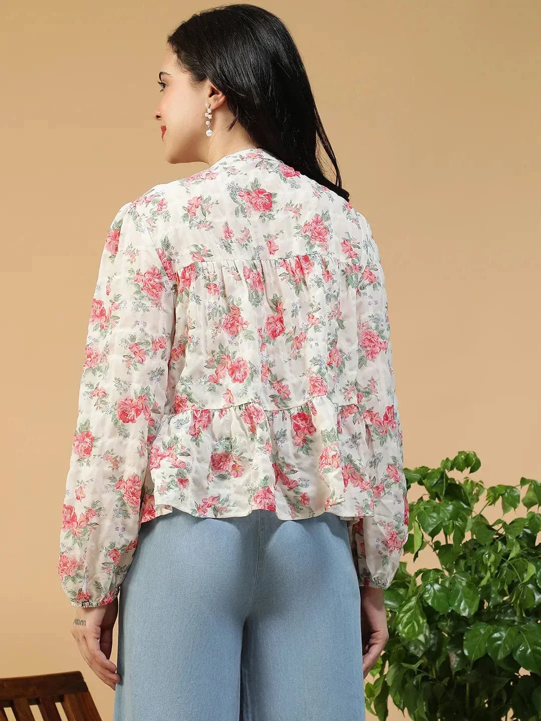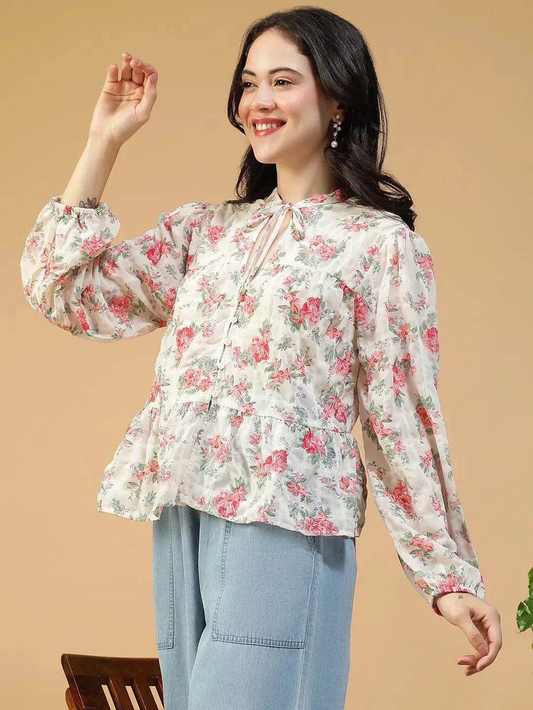 Get Florals, Flounce, And A Little Fun With Thisfresh Multicolor Floral Print Key Hole Neck With Tie-Up Detail Long Sleeve Women Peplum Top, Crafted In Smooth, Lightweight Polyester That Feels As Good As It Looks. Featuring A Chic Keyhole Neckline With Tie-Up Detail, Long Sleeves For A Touch Of Elegance, And A Flirty Peplum Hem, This Top Is All About Flattering Fits With A Playful Twist. The Multicolor Floral Print Brings Instant Freshness And Makes It A Perfect Pick For Any Season. Dress It Up With Trousers Or A Pencil Skirt For A Polished Formal Look, Or Pair It With Jeans And Heels For A Weekend-Ready Vibe. With Its Easy Charm And Flattering Silhouette, This Top Is The Perfect Blend Of Classy And Quirky, Because When In Doubt, Let Florals Do The Talking.