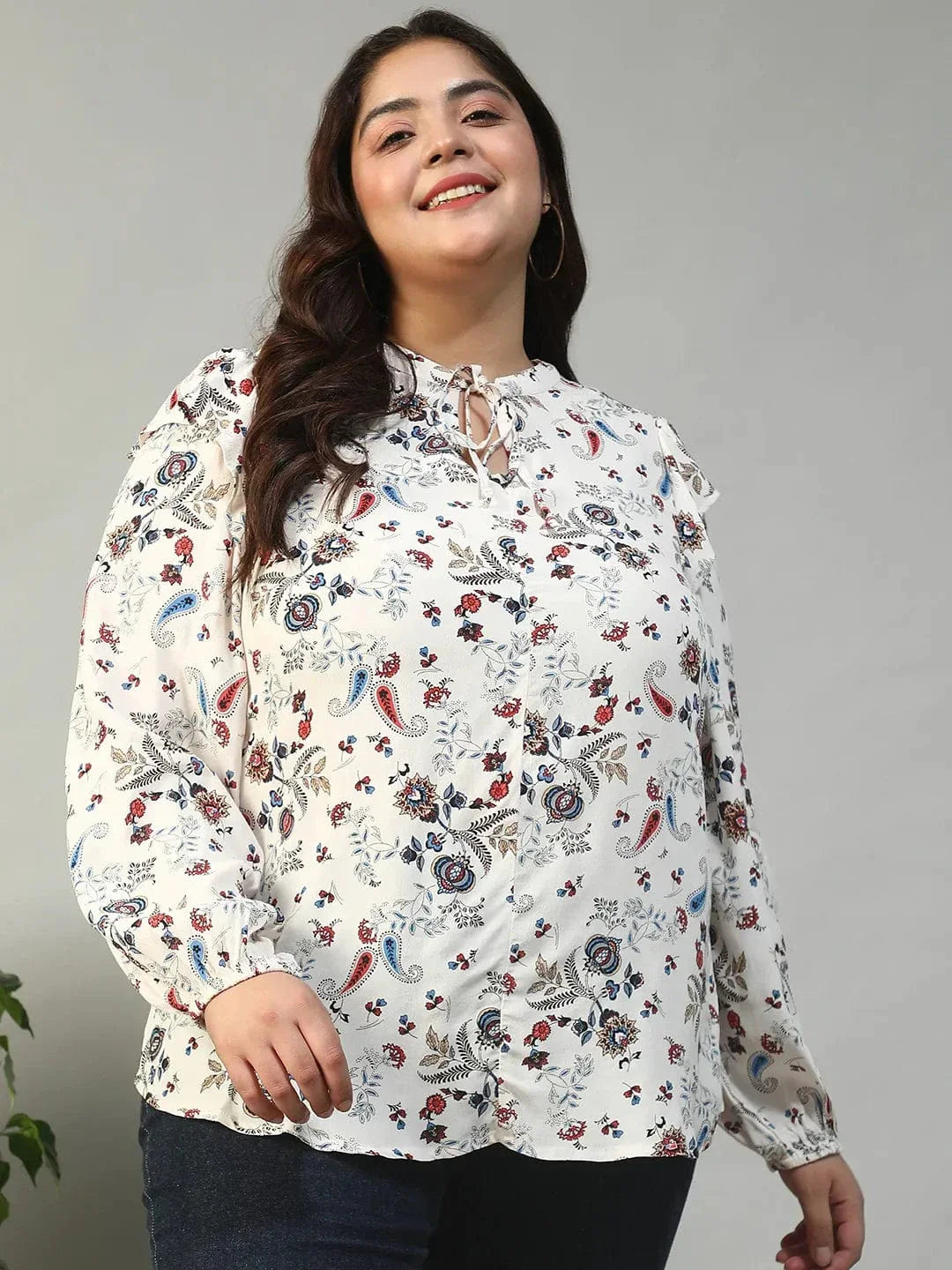 Turn Up The Charm I with Our Multicolor Floral Print Round Neck With Tie-Up Detail Long Sleeve Ruffle Flair Plus Size Women Top, Designed To Flatter Every Curve And Brighten Any Day. Crafted From Soft, Breathable Viscose Fabric, This Top Is Lightweight, Airy, And Feels Amazing Against The Skin. Perfect For All-Day Wear. Featuring A Round Neckline With A Cute Tie-Up Detail, Elegant Long Sleeves, And Delicate Ruffle Accents, This Piece Adds A Touch Of Femininity And Movement To Your Look. The Lively Floral Print Pops With Color, Making It A Joyful Wardrobe Essential That Works Across Seasons.
