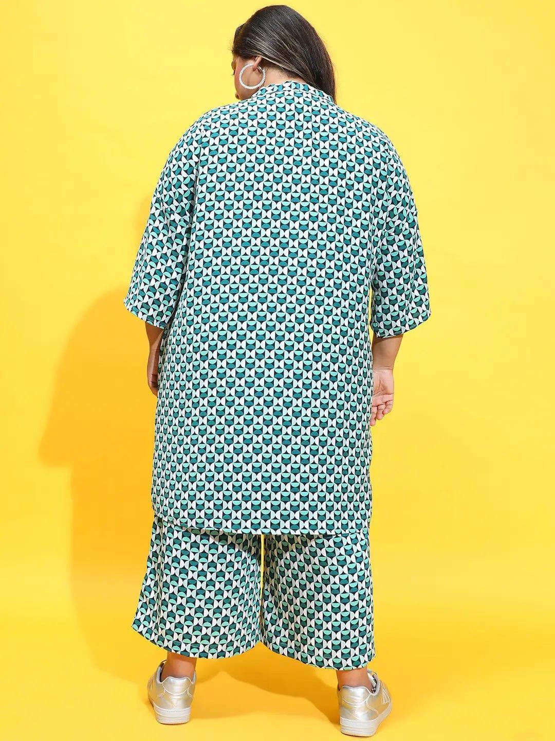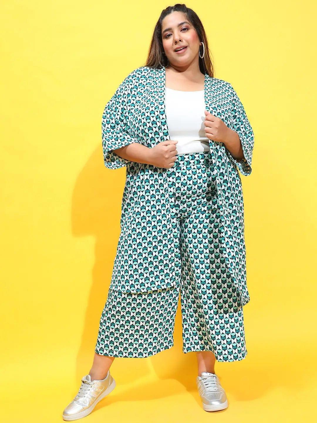 Introducing the Multicolor printed open shrug with culottes plus size co-ord set , where bold design meets effortless comfort. The open shrug features a latest print, 3/4 length sleeves, and a gracefully long length below the knee, adding flair to your ensemble. Crafted from lightweight polyester, it offers a smooth, airy feel ideal for all-day wear. Accompanying the shrug, the elasticated culottes ensure both style and practicality. Boasting an adjustable waistband for a personalized fit and convenient side pockets, they blend comfort with functionality seamlessly. This co-ord set is designed for versatility. Wear it as a coordinated outfit for a chic statement, or mix and match with other pieces in your wardrobe to express your unique style. Available in a range of plus sizes to give the fashionable expression.