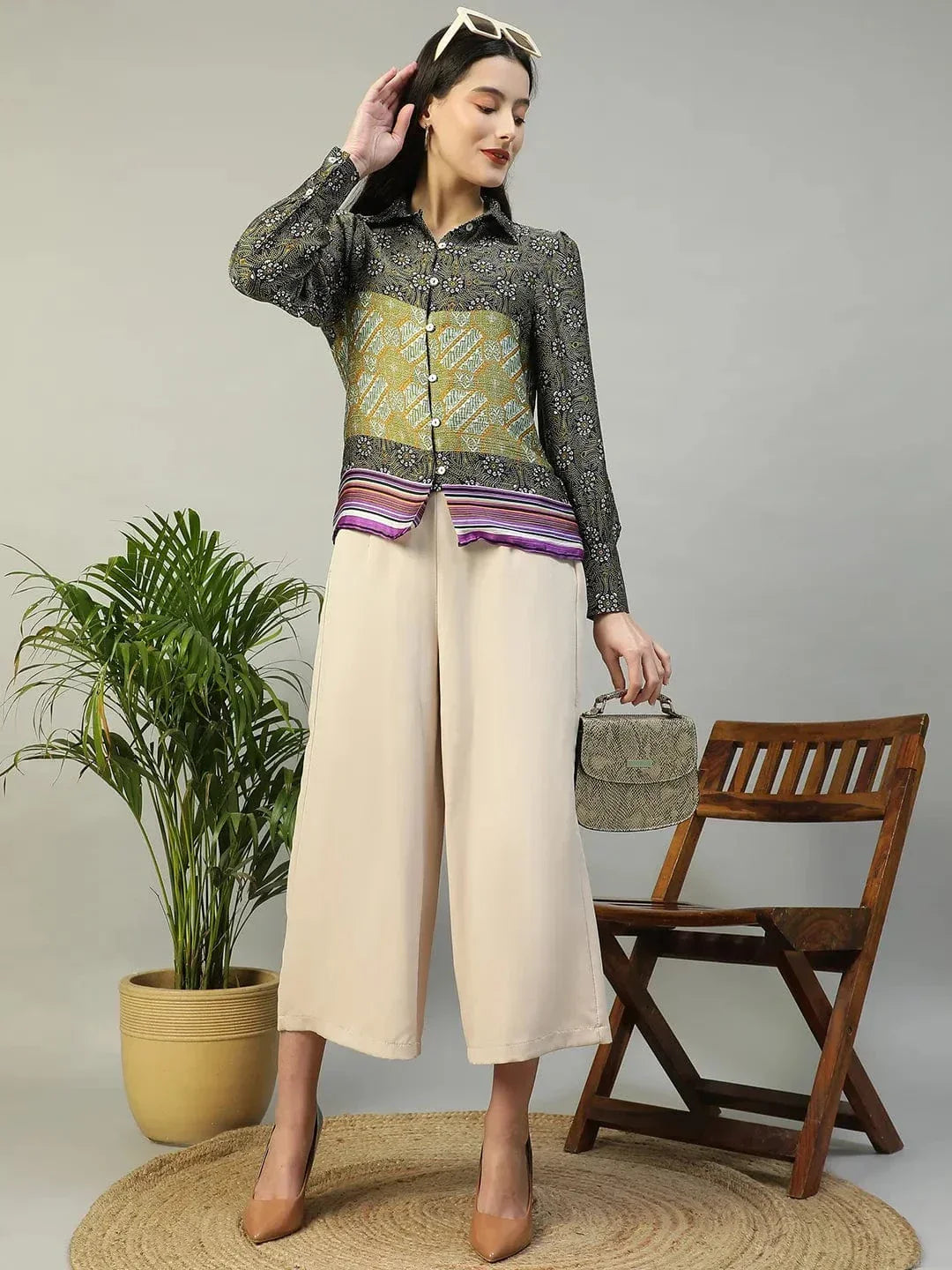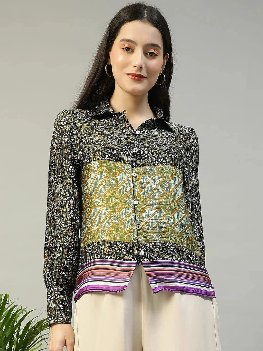 This Multicolor Printed Collared Button Down Long Sleeve Women Shirt is a perfect blend of bold style and comfort. Made from soft polyester fabric, it features a classic collared design and long sleeves for a polished yet relaxed look. The vibrant multicolor print adds a fun, eye-catching element, making this shirt ideal for both casual and semi-formal occasions. Whether tucked into jeans, paired with skirts, or layered with your favorite jacket, this shirt brings a pop of color and style to any outfit.