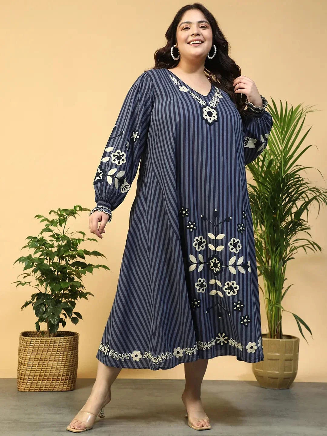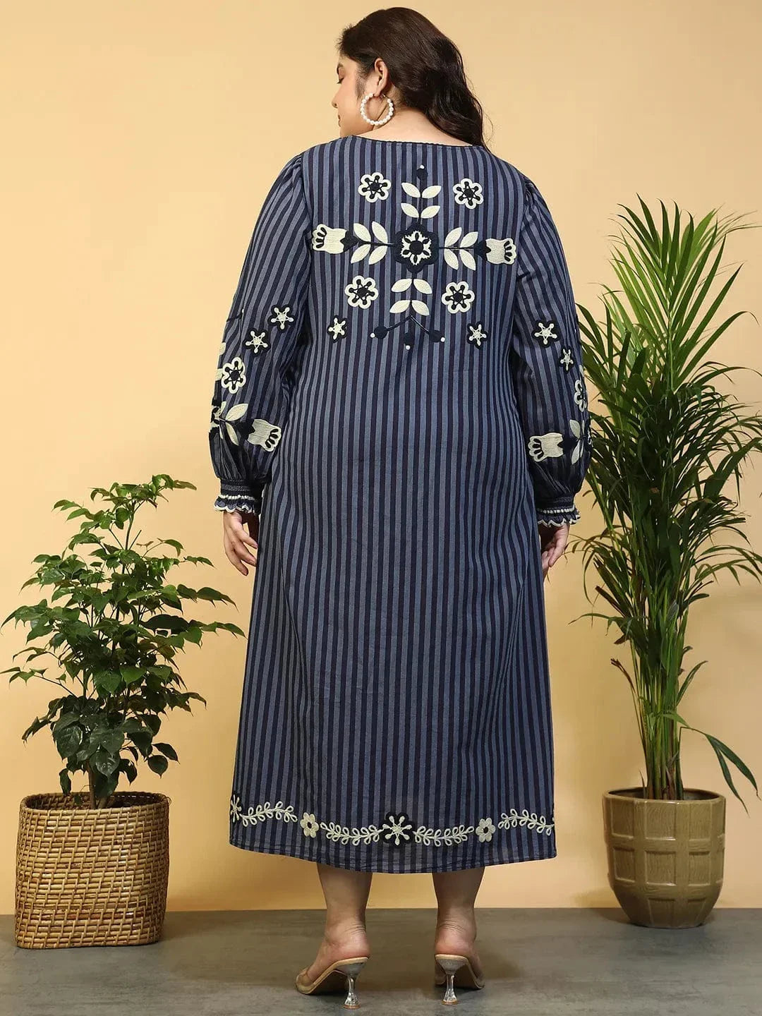 Elegance in Every Stitch with this Navy Blue Embroidered V-Neck Long Sleeve Yarn Dyed Cotton Plus Size Maxi Dress. Perfectly crafted from soft yarn-dyed cotton, this dress combines luxurious comfort with effortless style. The rich navy blue hue pairs beautifully with delicate embroidery, creating a sophisticated look that’s both timeless and unique. The V-neckline adds a flattering touch, while the long sleeves offer just the right amount of coverage. The flowing flare maxi skirt provides plenty of room for movement, giving you a graceful, feminine silhouette. Whether you're attending a special event or enjoying a casual day out, this dress is a versatile addition to your wardrobe.