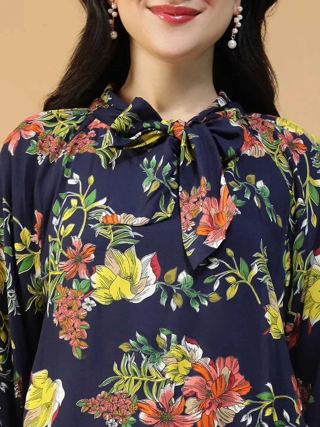 Bloom Where You’Re Planted, Especially In Style! This Flyer Navy Blue Floral Print Round Neck With Tie-Up Detail Long Sleeve Women Top Is All About Effortless Elegance With A Playful Twist. Crafted In Lightweight, Breathable Viscose, It Feels Soft Against The Skin And Drapes Beautifully, Making It Your Perfect Go-To For All-Day Comfort. The Round Neckline Gives It A Clean, Classic Look, While The Tie-Up Detail Adds A Fun, Customizable Touch, Wear It As A Bow For A Feminine Vibe Or Leave It Untied For Laid-Back Charm. Designed With Long Sleeves, It’S Versatile Enough For Every Season—Keep Them Full Length For A Sleek Silhouette Or Roll Them Up For Casual Outings. The Navy Blue Base Adorned With Vibrant Floral Prints Brings A Timeless Yet Trendy Feel, Making This Top Suitable For Work, Brunches, Dates, Or Even Weekend Getaways. It’S Chic, Comfy, And Made To Stand Out.
