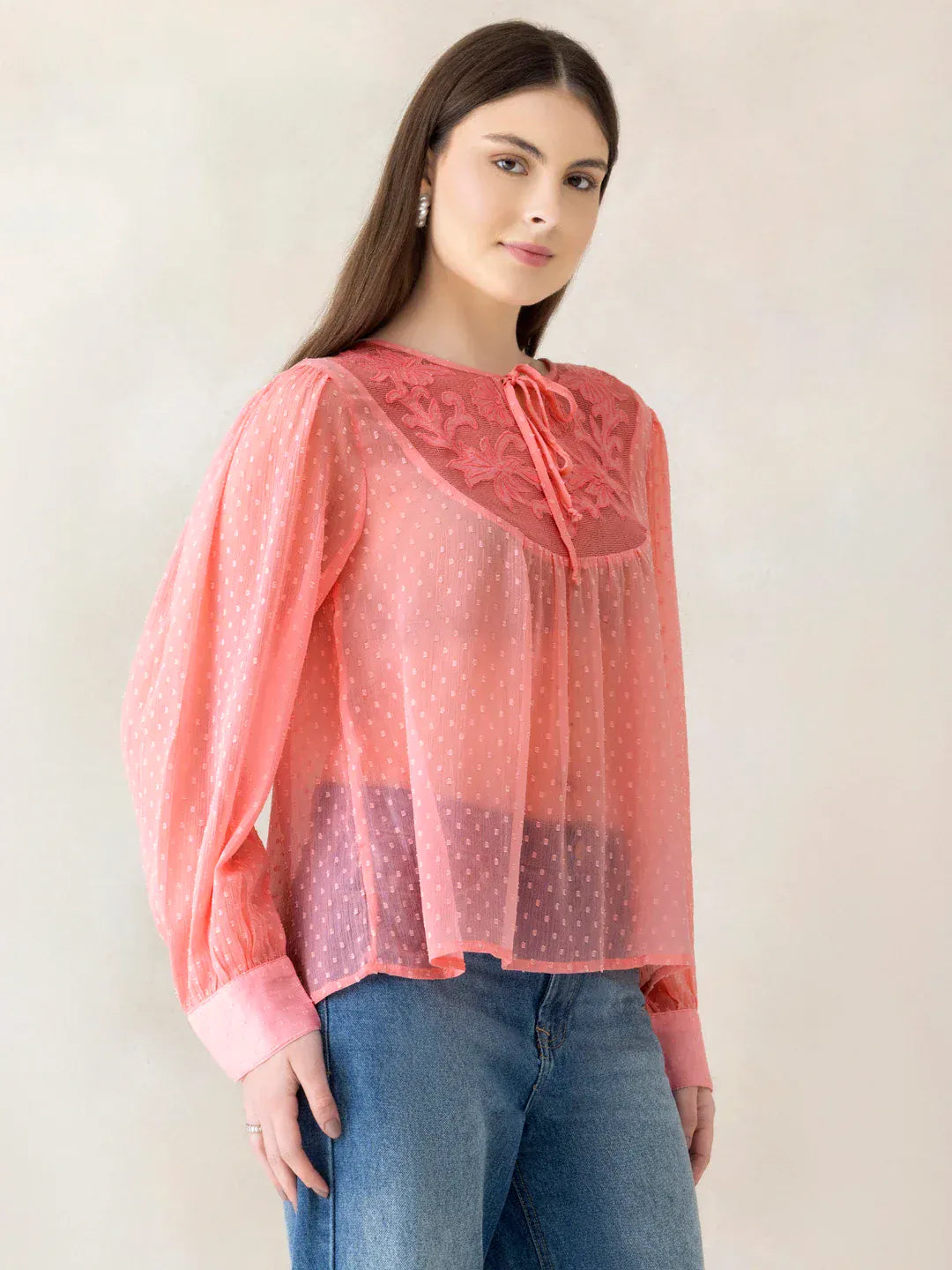 Upgrade your daily outfits with this trendy Peach top. Crafted in premium Polyester fabric, it offers a comfortable Regular Fit fit that flatters your silhouette. Its embroidery pattern gives it a fresh modern vibe, while the long sleeve sleeves and round neck neckline make it a standout choice. Perfect for casual, this women top pairs beautifully with denim and layered looks.