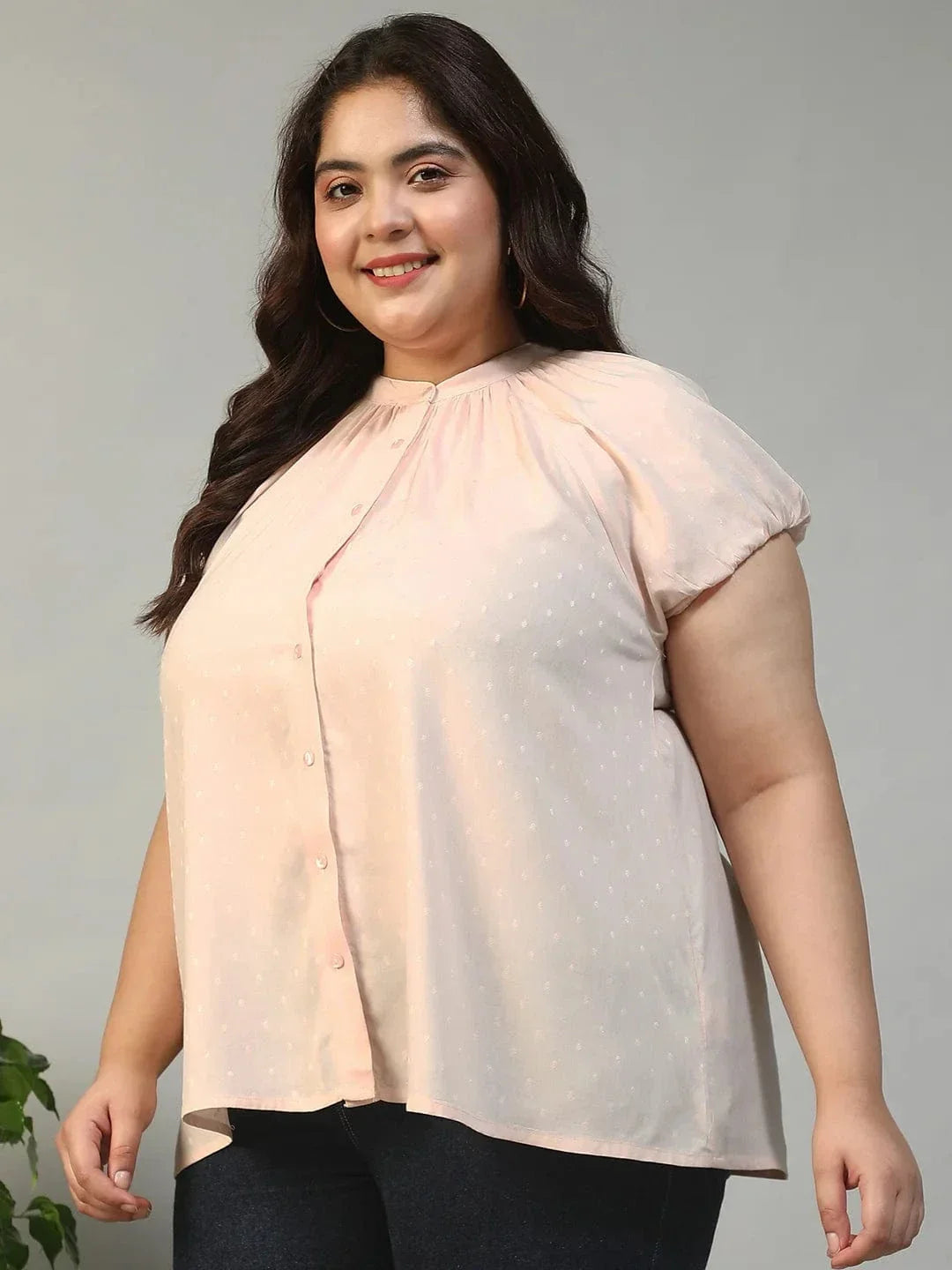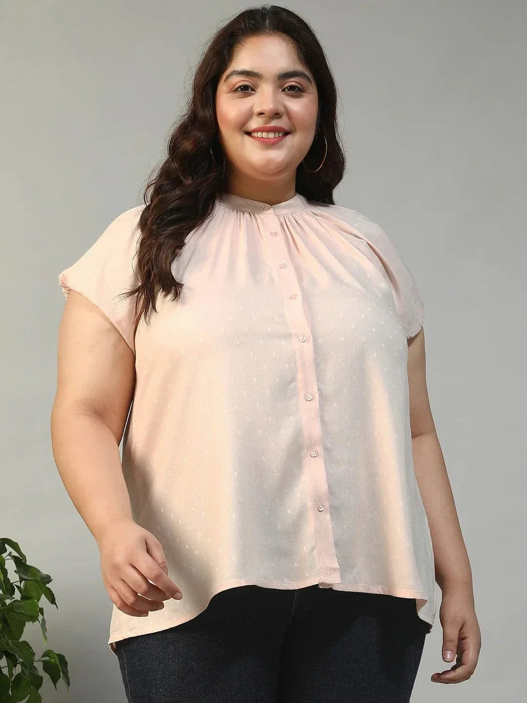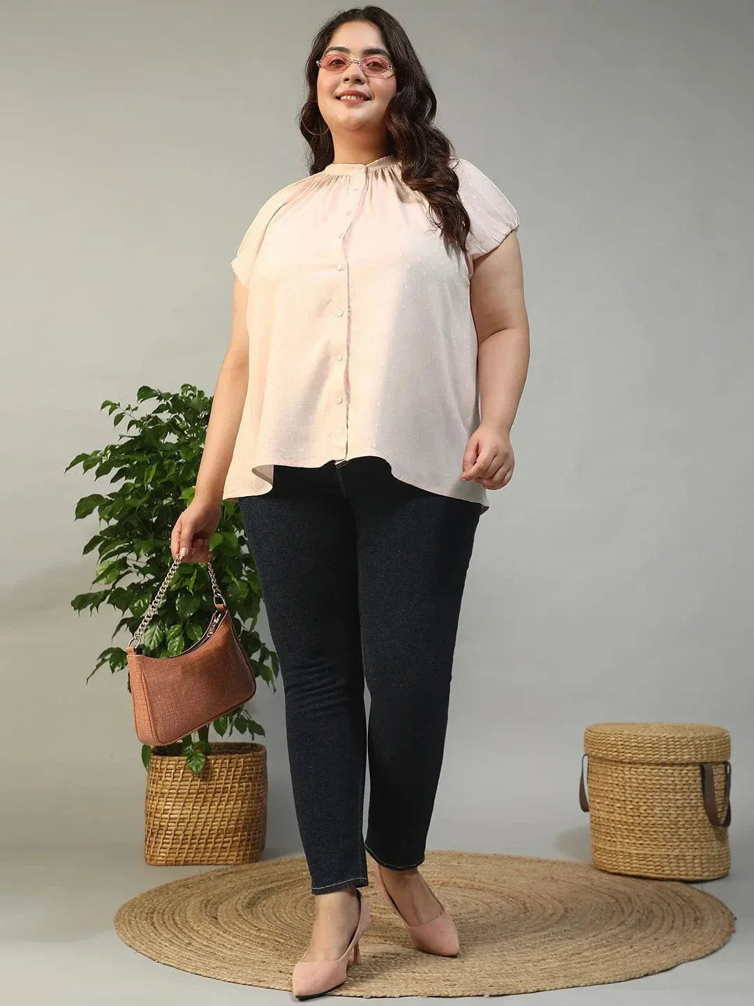 Perfect Peach Gather Detail Short Sleeve Button Down Rayon Swiss Dot Dobby Plus Size Women Shirt is crafted in breezy viscose rayon Swiss dot dobby fabric. The round neckline offers a soft, feminine appeal, while the button-down front provides ease and versatility. Designed with gathered detailing in front, it gracefully skims your curves without clinging, giving a relaxed yet flattering silhouette. The delicate textured dot weave adds a subtle, stylish dimension to the classic white shirt—making it a wardrobe essential that transitions effortlessly from day to night.Â