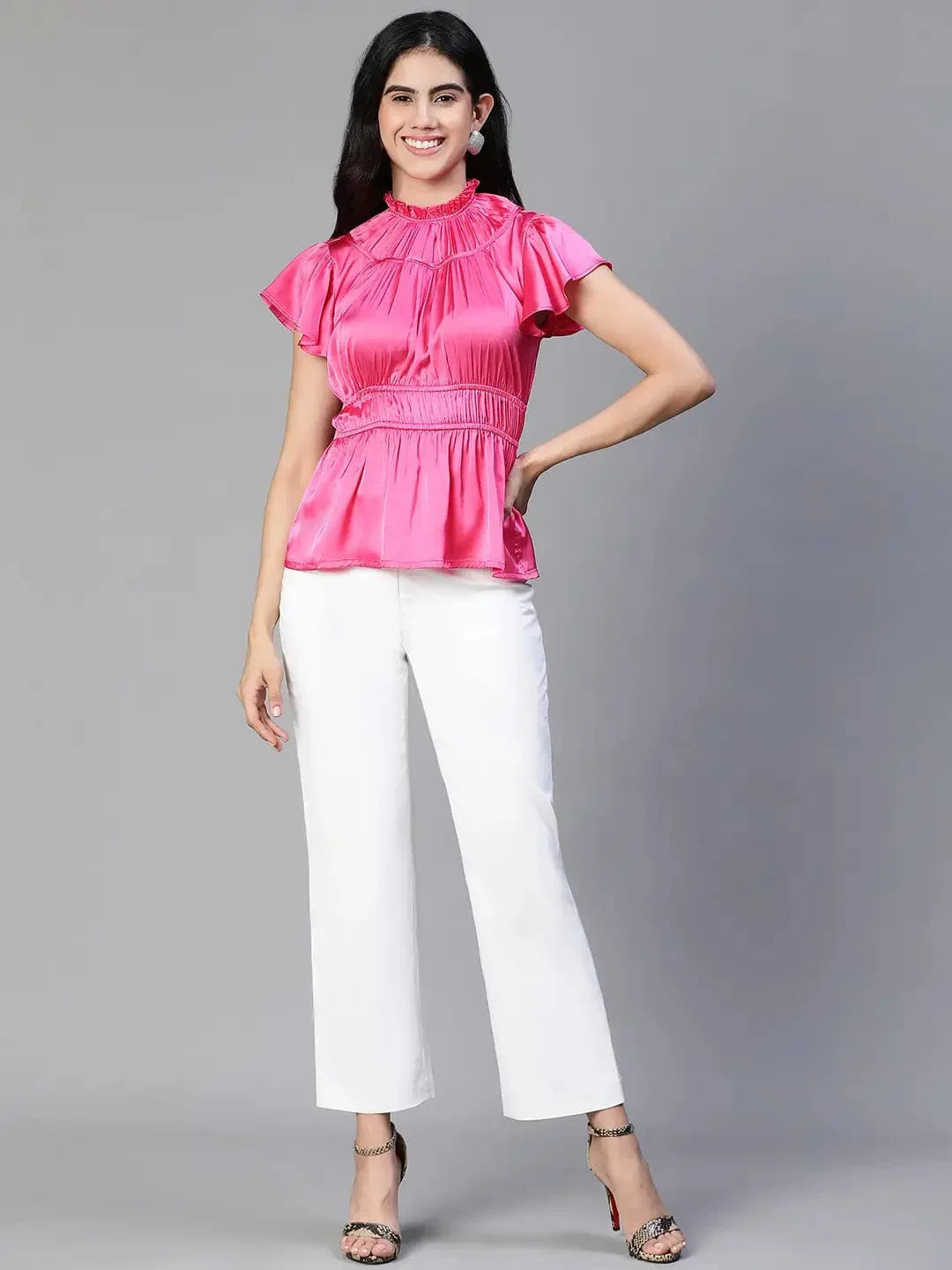 Your pink round neck ruffle elasticated satin women party top is a pretty top to wear on gala nights to birthdays and casual parties. Made with polyester fabric, it is fashionablaly comfortable and has a perfect fit. It features round ruffle neck, circular cup short sleeves, elasticated and flared hem with a length to the waist. Pair it with pants or jeans to get the complete look and look chic babe