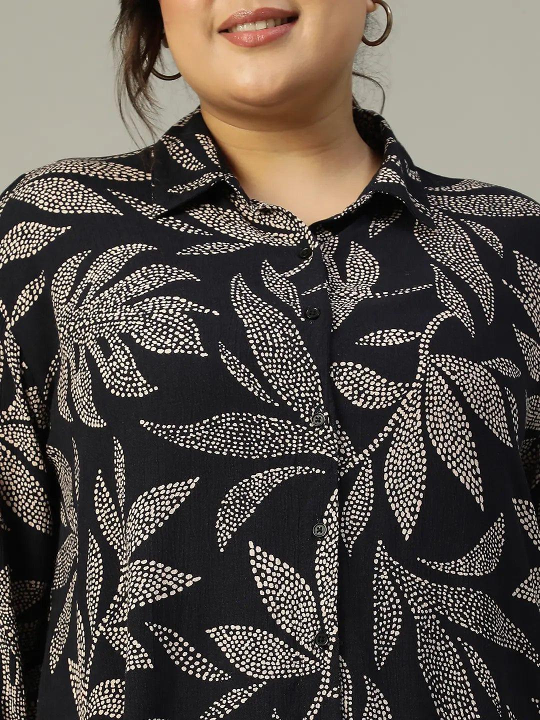 Refresh your wardrobe with thisBold Black Tropical rayon print Collared Button-Down Plus-Size Women Shirt, made from soft and breathable viscose fabric for ultimate comfort. The shirt features a chic collared neckline, long sleeves, and a button-down closure for a versatile look. Its striking tropical rayon print stands out against the bold black background, making it perfect for both casual and semi-formal settings. Pair it with jeans, skirts, or trousers and adds a touch of fun and sophistication to your outfit.