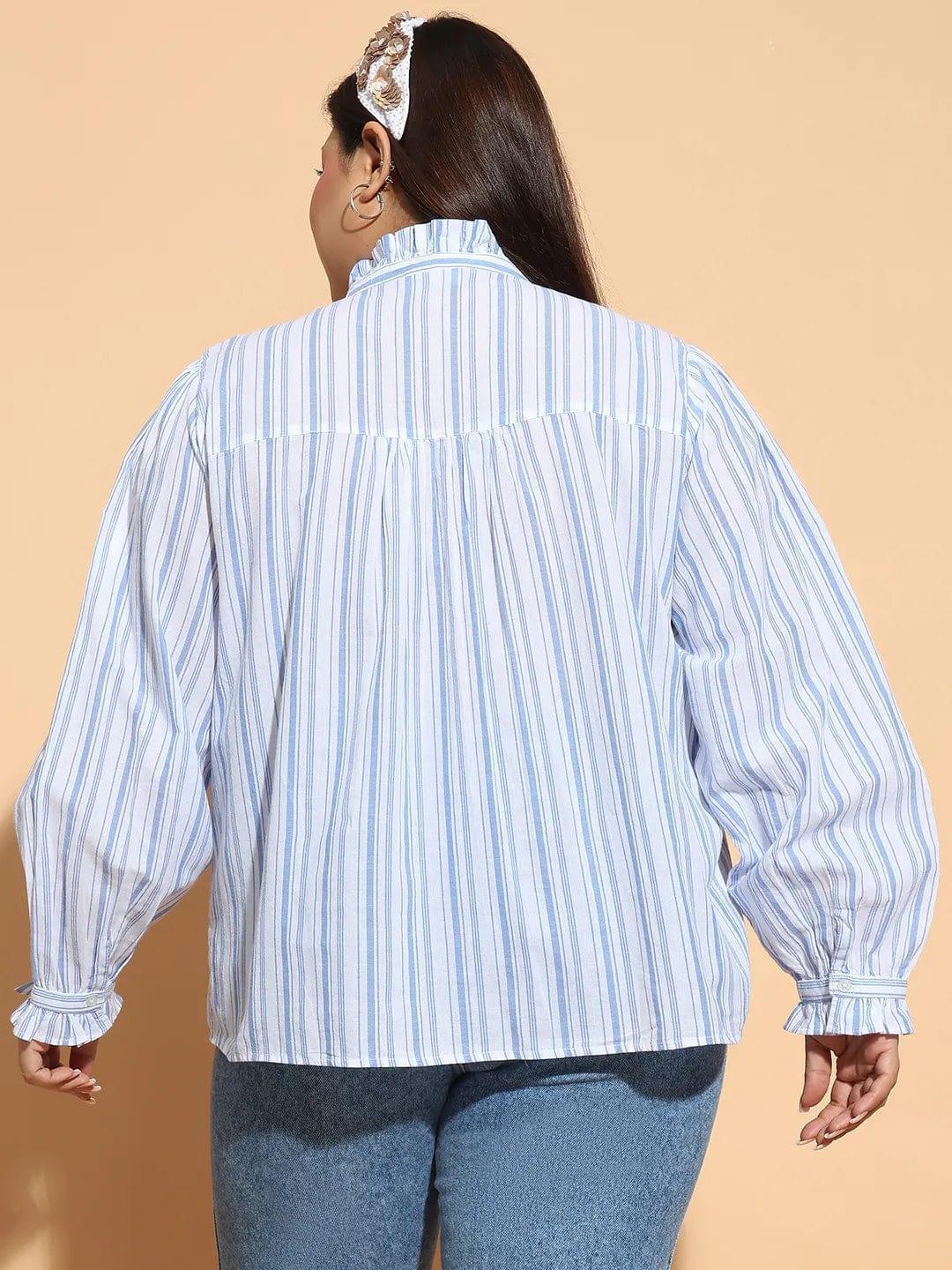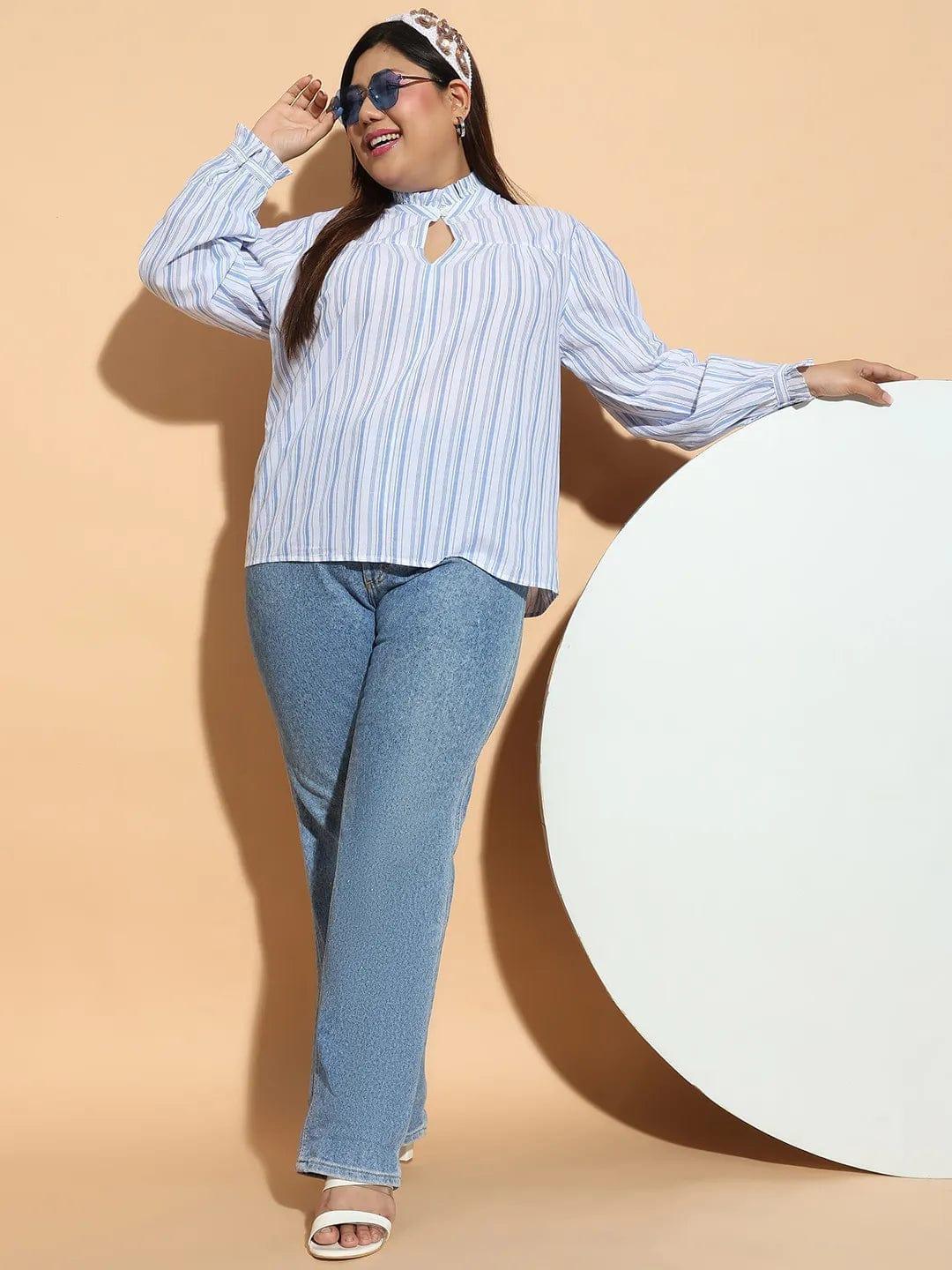 This Blue Stripe Print Round Neck With Button & Keyhole Dobby Meld Plus Size Cotton Top offers a stylish mix of comfort and sophistication. Crafted from soft, breathable cotton, this Top features a classic blue stripe print that adds a fresh, modern touch. The round neckline, accented by a button and keyhole detail, gives the top a charming, feminine feel. With long sleeves and a relaxed fit tailored for plus-size figures, this top ensures ease of movement while flattering your shape. Perfect for casual outings or semi-formal events, it pairs effortlessly with jeans, skirts, or trousers, making it a versatile addition to your wardrobe.
