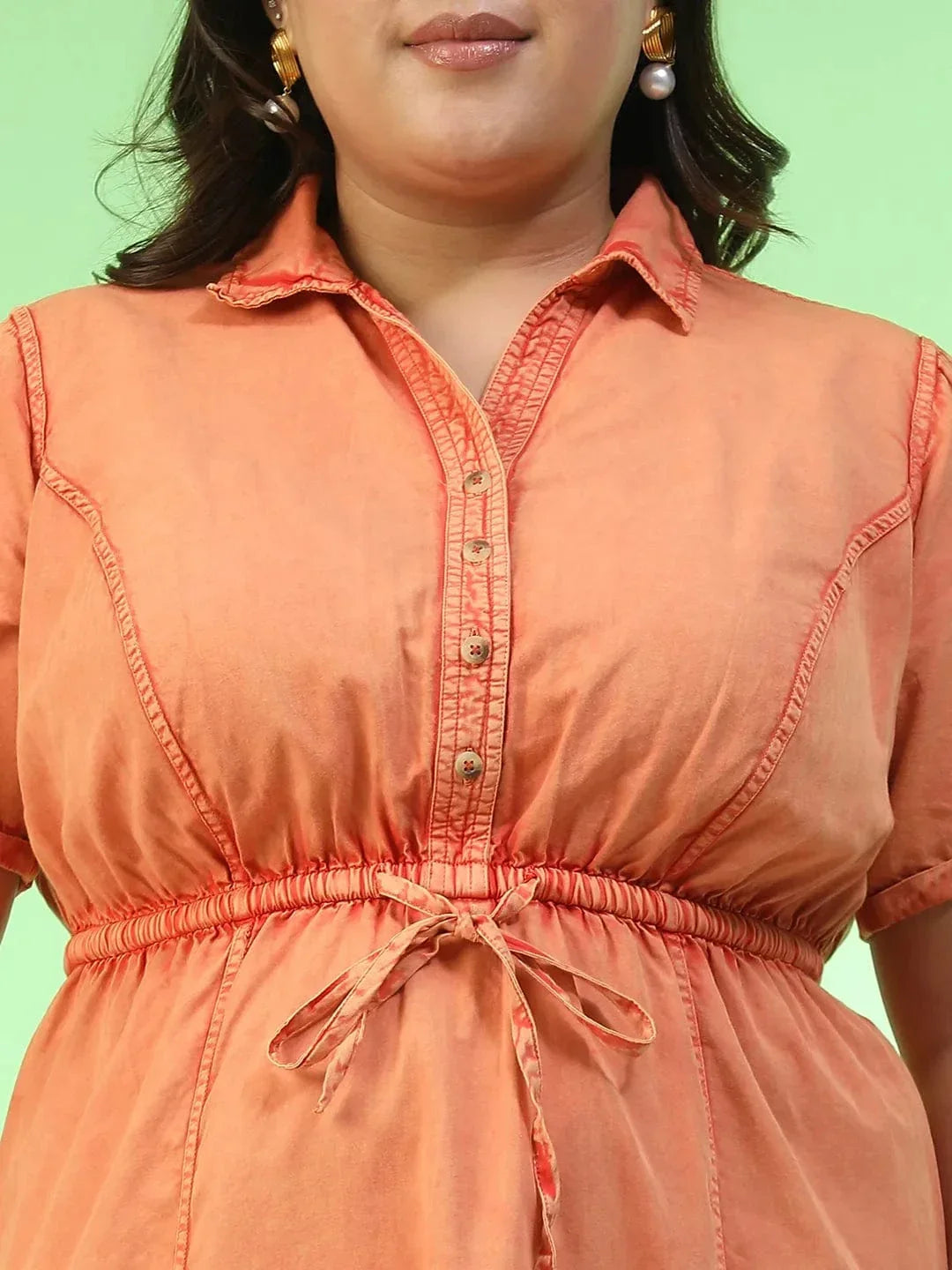 Why settle for ordinary when you can shine in this Glamoured Orange Collared Short Sleeve Elasticated Tie-Up Detail Button Down Plus Size Dress Women Cotton Dress - designed to flatter curves and make dressing up effortless. The cheerful orange hue adds instant brightness to your look every time. The classic collared neckline and button-down front keep it structured yet versatile for many occasions. Falling below the knee, it strikes the perfect balance between chic and comfortable. This makes it ideal for everything from casual outings to semi-formal get-togethers with ease. The real highlight is the elasticated waist with adjustable tie-up detail. It cinches gently to define your shape while giving you the flexibility to style it your way – tied in a neat bow for polish or knotted casually for laid-back vibes. The short sleeves keep it breezy, and the functional side pockets make it as practical as it is stylish. Crafted in soft, breathable cotton, this plus size dress ensures all-day comfort without compromising style. It is a true wardrobe hero for plus-size women who love fashion with ease.