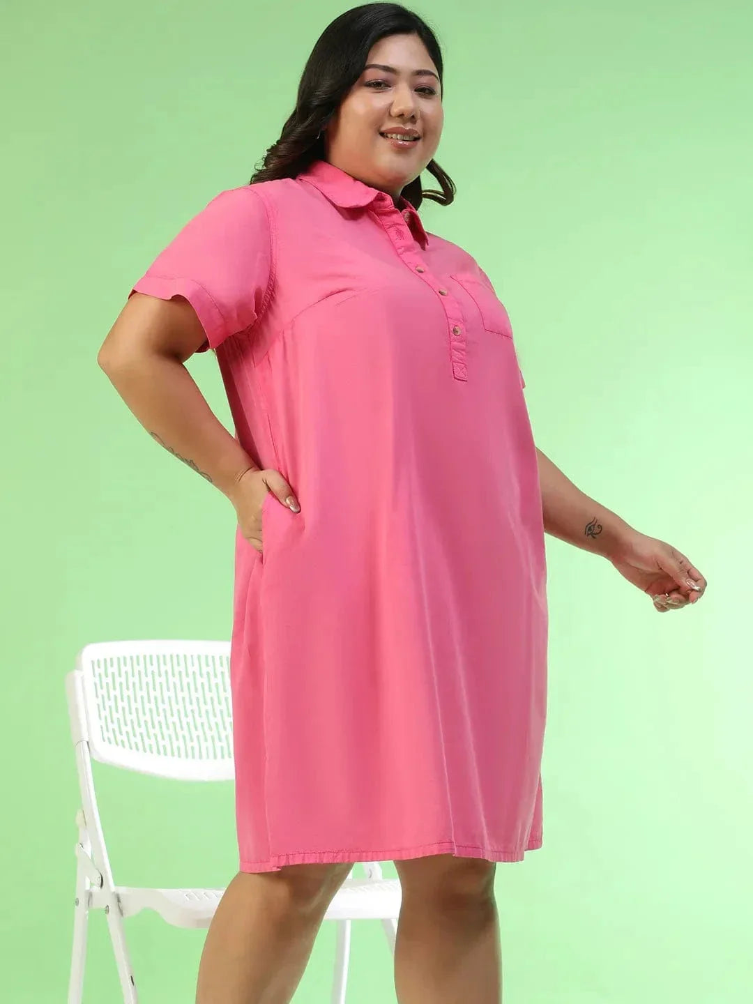 Feminine, fresh, and effortlessly stylish - this Mania Pink Collared Button Detail Short Sleeve Plus Size Women Cotton Dress is made to flatter curves while keeping you cool and comfortable. The soft pink hue adds a playful yet elegant touch, while the classic collared neckline with button detail brings structure and polish to the look. Designed in a knee-length silhouette, it’s versatile enough for workdays, brunch outings, or casual evening plans. With short sleeves for breathable ease, this dress also comes with side pockets and a chest pocket, blending practicality with style. The lightweight, breathable cotton fabric drapes smoothly over plus-size silhouettes without clinging, making it a go-to choice for all-day wear. Whether you keep it casual or dress it up, this pink beauty is all about comfort meeting charm.