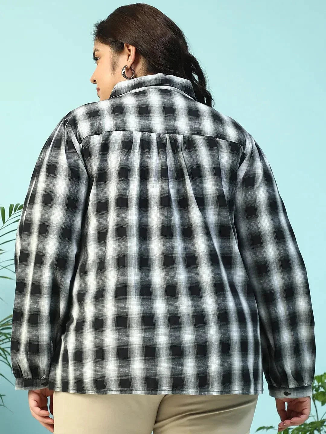 Step up your style game with this Dusky Black Yarn-Dyed Check Print Collared Long Sleeve Button Down Plus Size Women Cotton Shirt.