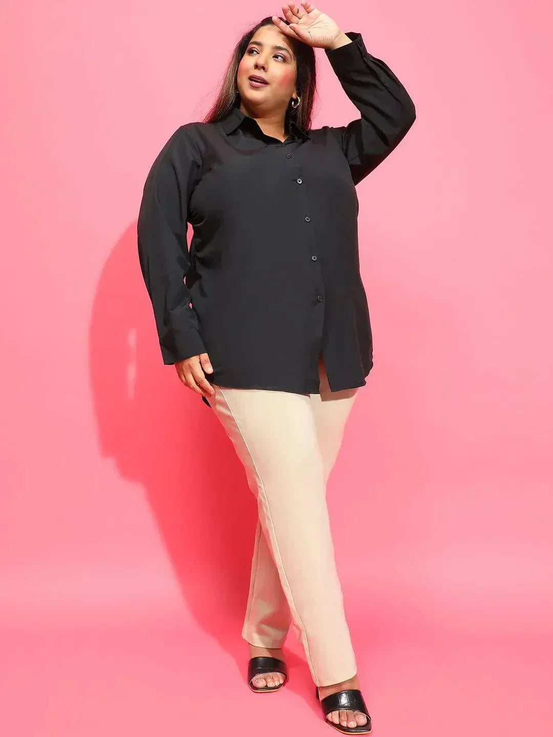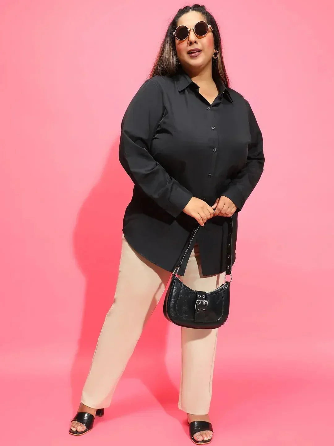 Mad Black Long Sleeve Collared Plus Size Women Cotton Shirt, meticulously crafted from soft and breathable cotton for ultimate comfort and style. This classic shirt features a refined collared neckline and long sleeves, offering a versatile silhouette that exudes understated elegance. The solid black color enhances its versatility, effortlessly pairing with a range of bottoms for any occasion. Designed with practicality in mind, the button-down front allows for easy wear and adjustable styling, while the long sleeves provide coverage and a polished look. Whether worn tucked into tailored trousers for a professional ensemble or casually untucked with jeans, this shirt embodies effortless chic.
