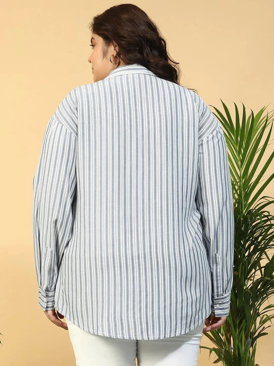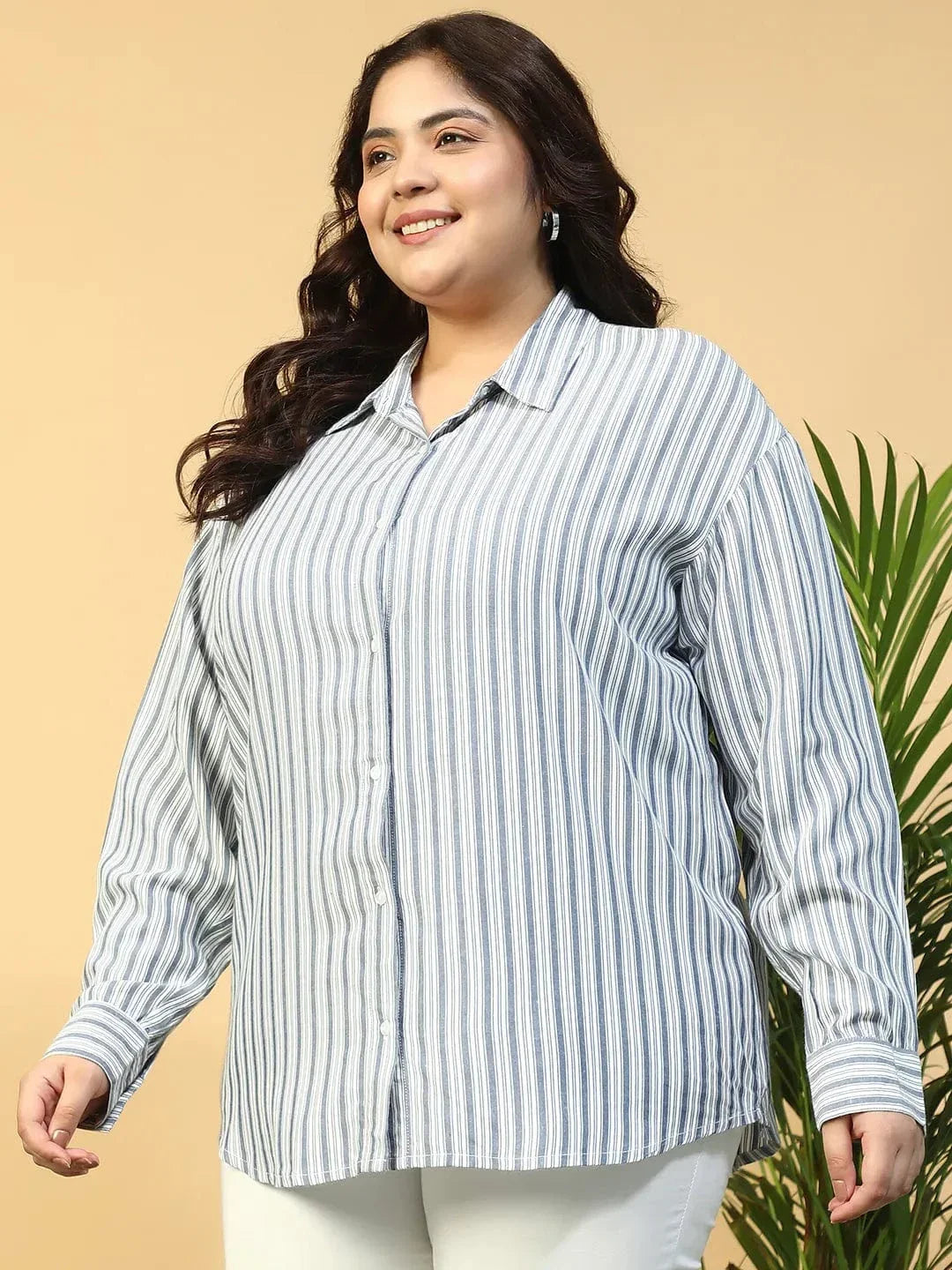 Bring effortless sophistication to your wardrobe with this Official Blue Collared Stripe Print Long Sleeve Button Down Linen Plus Size Women's Cotton Shirt. Tailored for comfort and confidence, this collared, long sleeve button-down features a timeless vertical stripe. Made from breathable cotton, it offers a relaxed fit that moves with you throughout the day. Whether you're heading to the office or styling it for a casual day out, this shirt is a versatile must-have. Style it with white denim for a crisp, fresh look or layer it over a tank for easygoing charm.