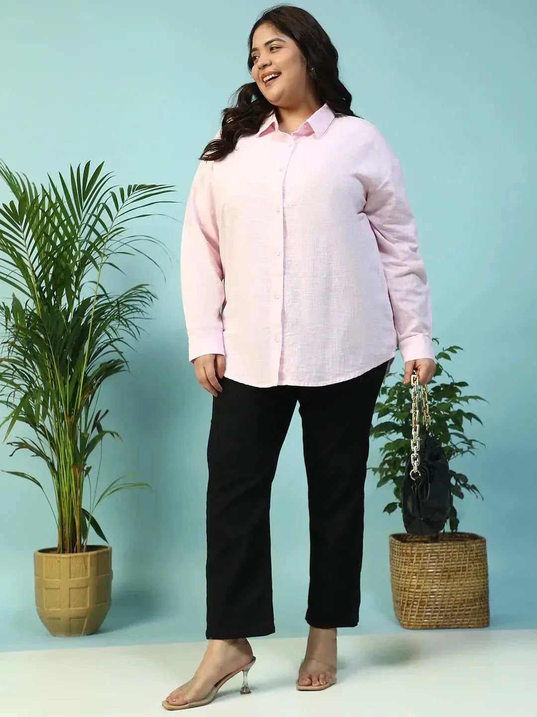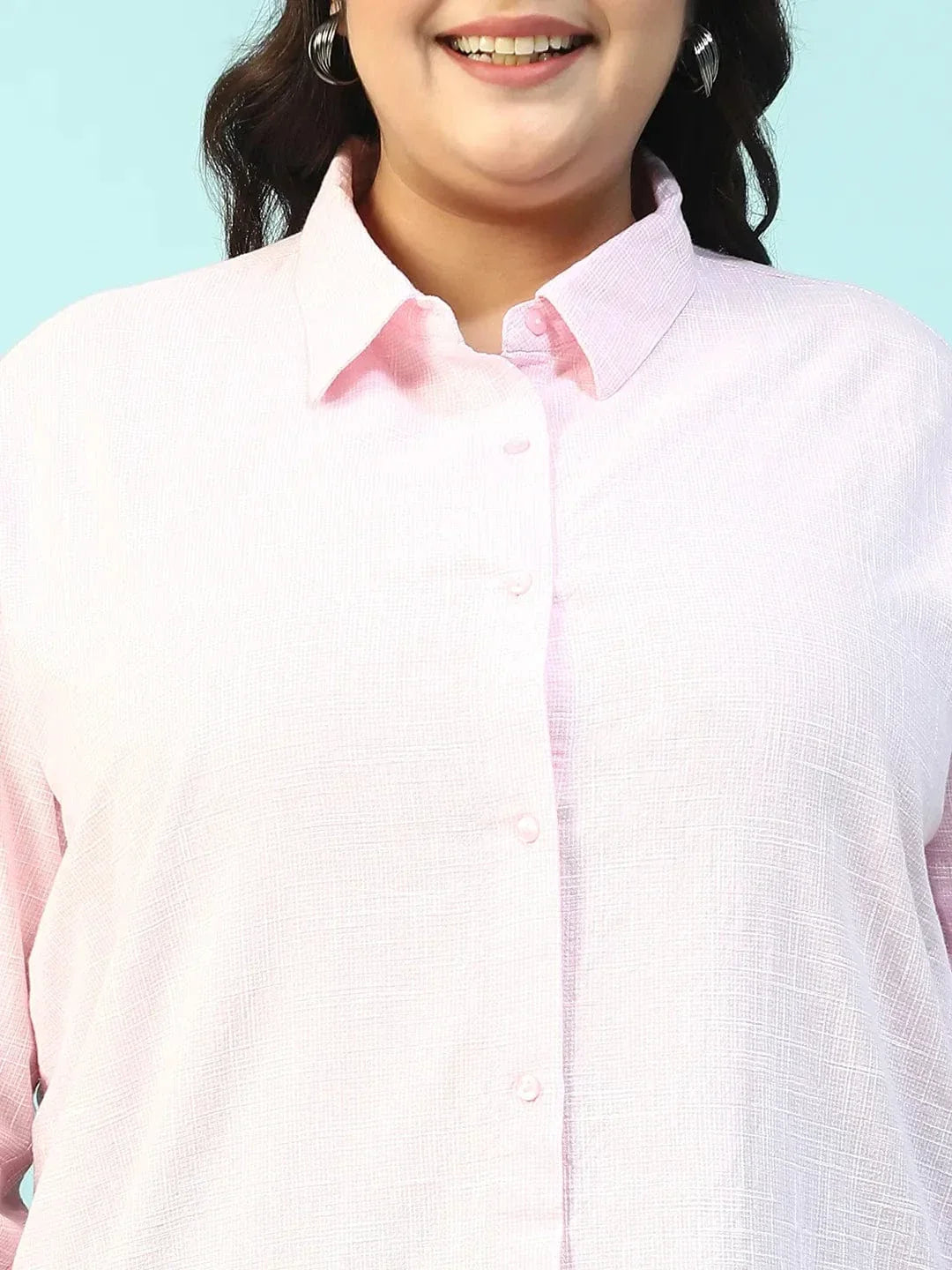 Curated Pink Yarn-Dyed Collared Long Sleeve Button Down Plus Size Women Cotton Shirt is crafted from breathable yarn-dyed cotton, this long sleeve button-down offers a naturally rich weave that adds depth to your everyday style. The classic collar, crisp cuffs, and flattering cut are tailored to complement fuller figures without compromising on comfort. From boardroom days to weekend plans, this sheet works for all days. Style it tucked into linen trousers for a smart, breezy feel or wear it open over a tank for cool, casual layering.