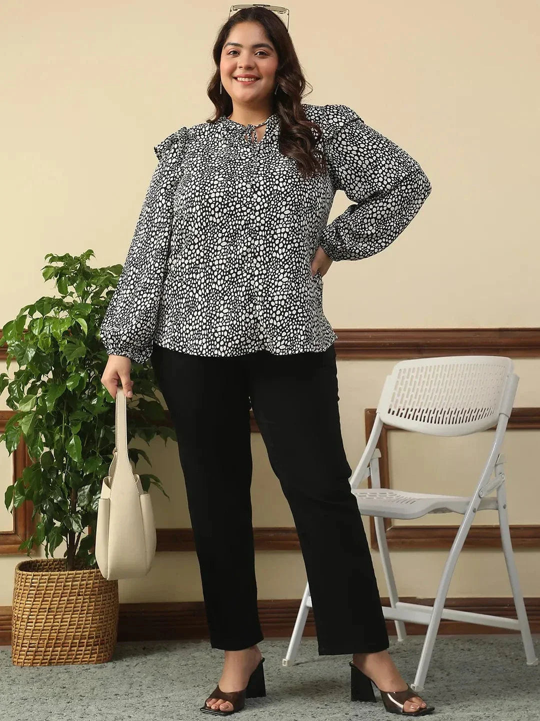 Make A Bold Style Statement With Ourbitzy Black Animal Print Round Neck With Tie-Up Detail Long Sleeve Ruffle Flair plus-size women's Top, Tailored For Plus-Size Women Who Love Fierce Prints And Flattering Fits. Crafted From Lightweight, Wrinkle-Resistant Polyester Fabric, This Top Is As Easy To Wear As It Is Eye-Catching. The Round Neckline With A Chic Tie-Up Detail Adds A Playful Touch, While The Long Sleeves And Delicate Ruffle Accents Bring A Soft, Feminine Balance To The Edgy Animal Print. Whether you're Stepping Out For Brunch, Heading To Work, or Dressing Up For The Evening, This Top Delivers Both Comfort And Confidence.