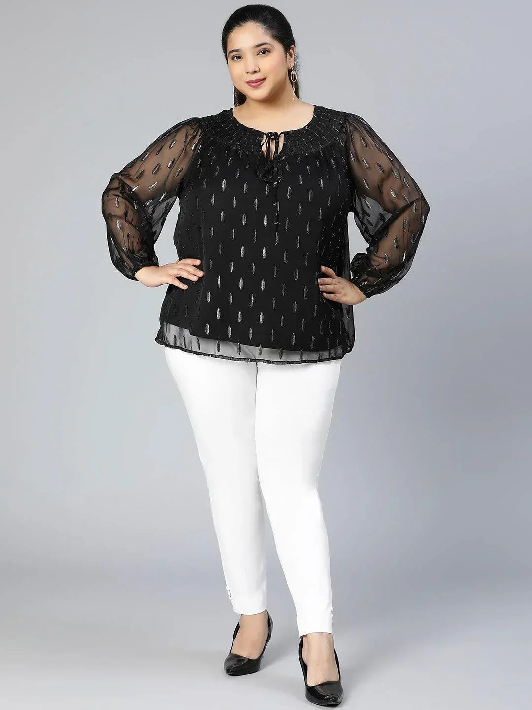Grace your closet with some Blinky fashion and add this Winky black Lurex print plus size party wear Loopy Top. Which is glam up with an all-over Lurex print, round neck. Along with a tie-knot thread, and smocking on the yoke, long sleeves, and a length to the hip. It is melded in all glitters and jitters for an outright party look and to make your look more appealing pair it with trendy shorts, denim jeans, or white pants. Do this and be the slayer diva of fashion.